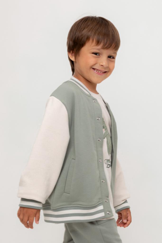 Бомбер с контрастными рукавами для мальчика. Изготовлен из мягкого петельчатого трикотажа. Застёгивается на кнопки. Воротник, манжеты и пояс - вязаные. Спереди карманы с листочкой.