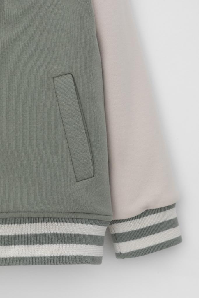 Бомбер с контрастными рукавами для мальчика. Изготовлен из мягкого петельчатого трикотажа. Застёгивается на кнопки. Воротник, манжеты и пояс - вязаные. Спереди карманы с листочкой.