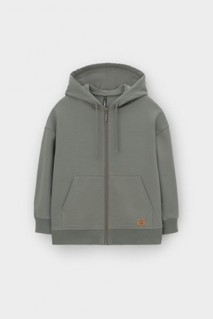 Трикотажная толстовка с капюшоном из петельчатого футера. Застёгивается на молнию. Спереди удобные накладные карманы. Манжеты и пояс из эластичного трикотажа в рубчик.