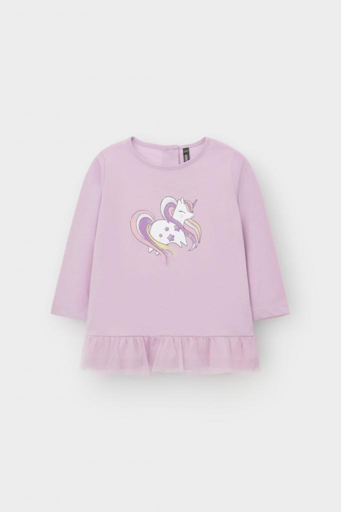 Туника для девочки из супрема, длинные втачные рукава, по горловине обтачка, на спине застежка на 2 кнопки. По низу туники широкая оборка, печать на полочке.