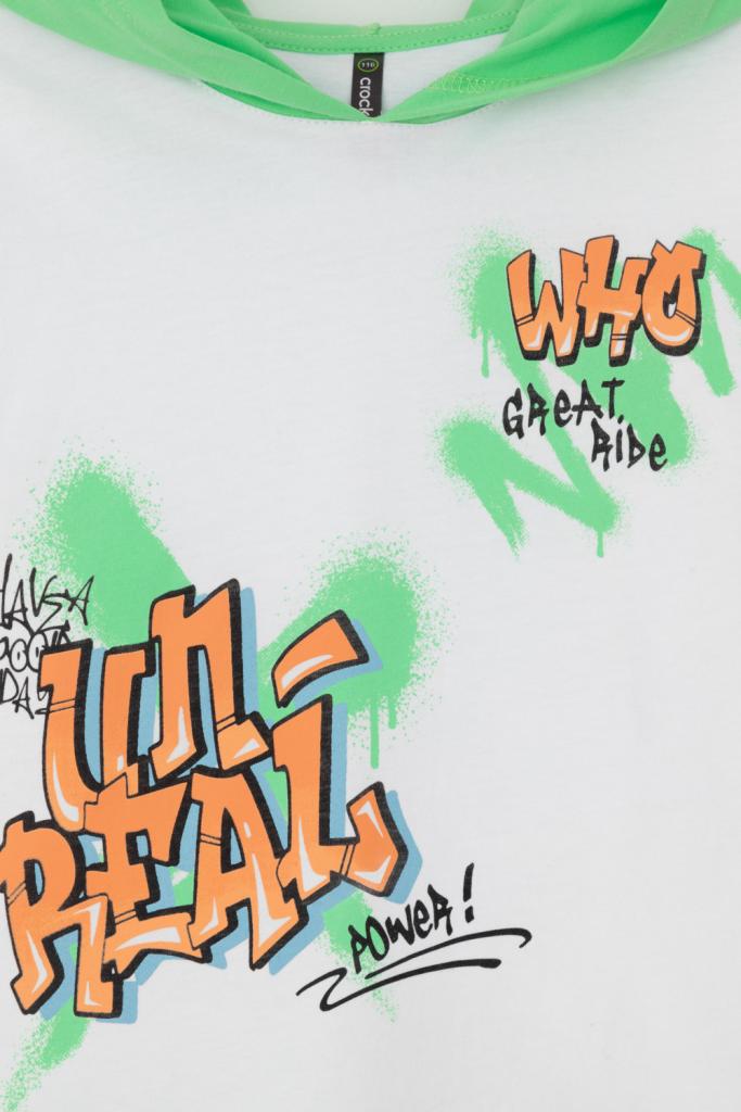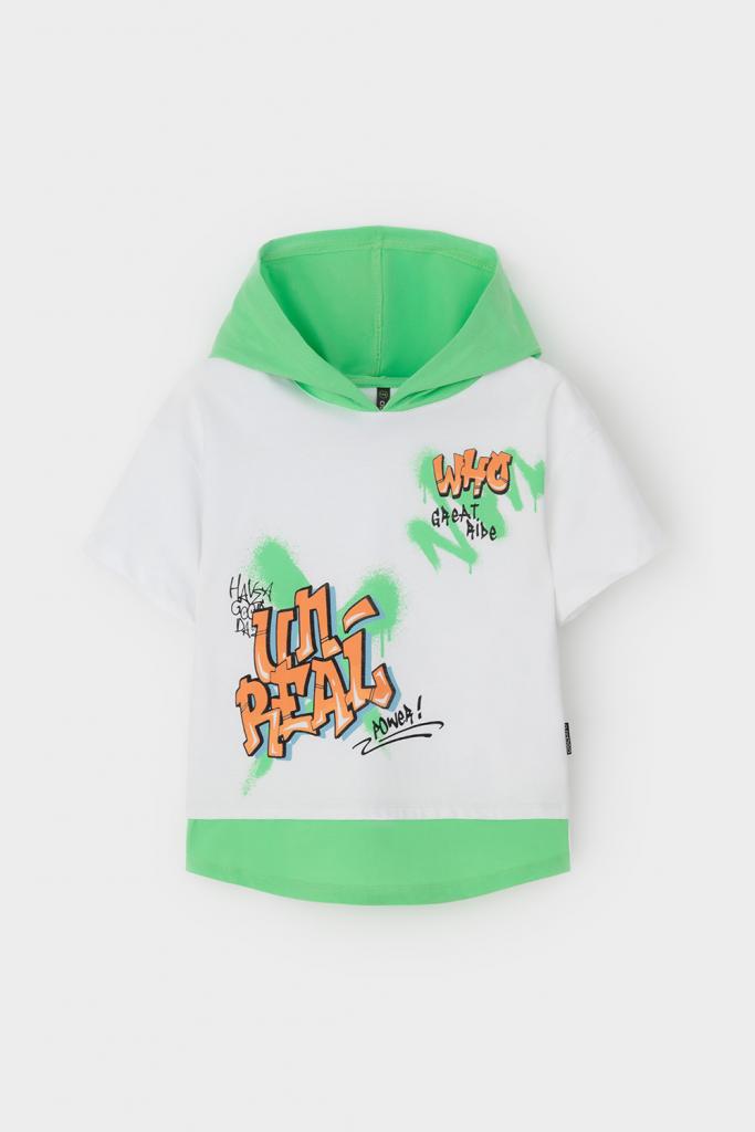 Футболка с капюшоном для мальчика из высококачественного трикотажного полотна. Оригинальный принт выполнен из стойких текстильных гипоаллергенных красителей.