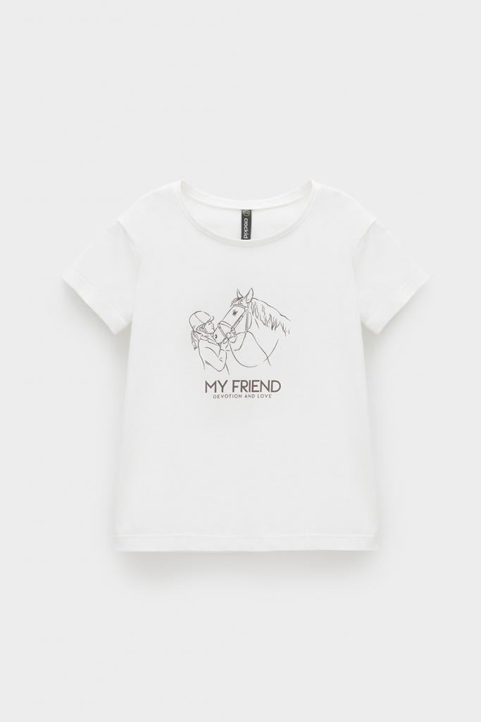 Футболка для девочки из высококачественного трикотажного полотна. Оригинальный принт выполнен из стойких текстильных гипоаллергенных красителей. Для удобства предусмотрена застежка на 2 кнопки в размерах 92 и 98.
