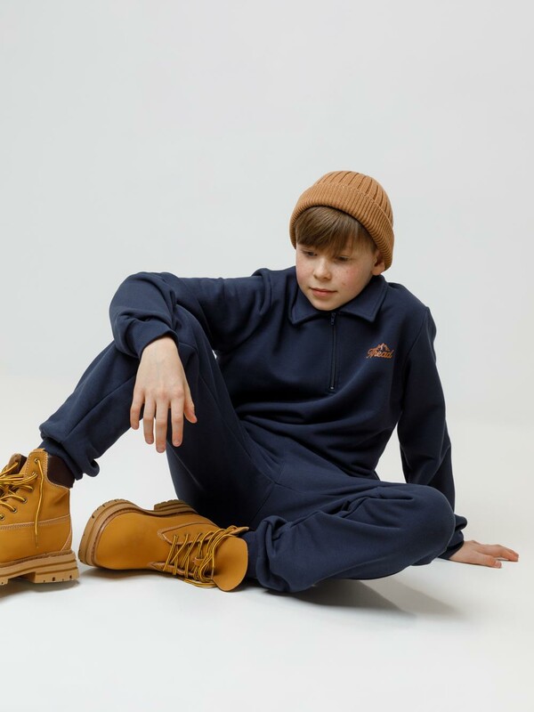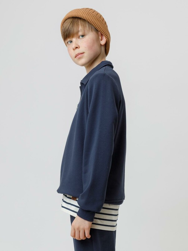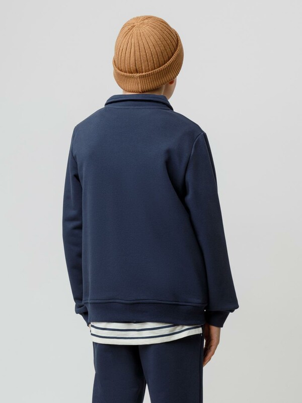 Свитшот с воротником для мальчика. Изготовлен из высококачественного петельчатого футера. В составе 80% натурального хлопка и 20% полиэстера, при этом полиэстер ввязан внутрь по особой технологии и не соприкасается с кожей. Манжеты и пояс выполнены из эластичного полотна. На груди короткая застёжка на молнию. Оригинальный принт выполнен из стойких текстильных гипоаллергенных красителей. Изделие сохраняет цвет и форму после многократных стирок.