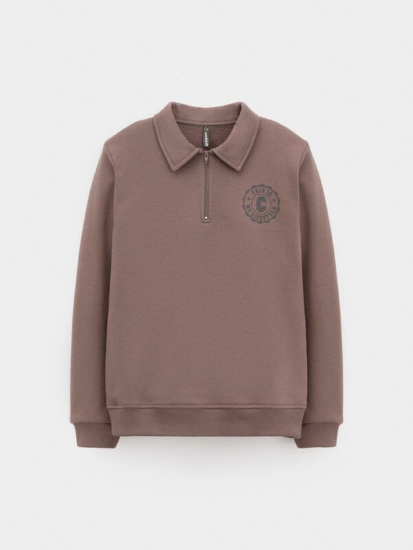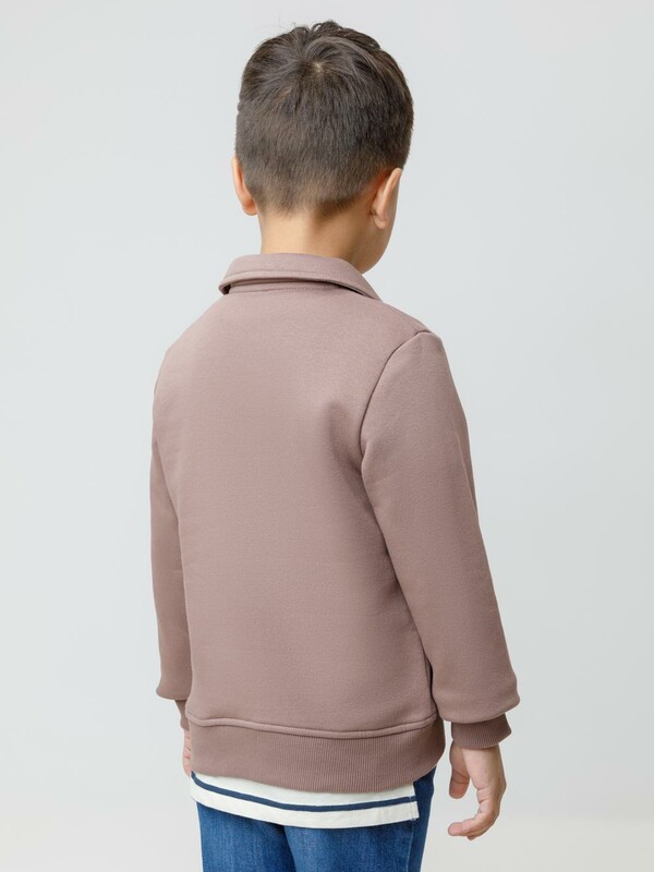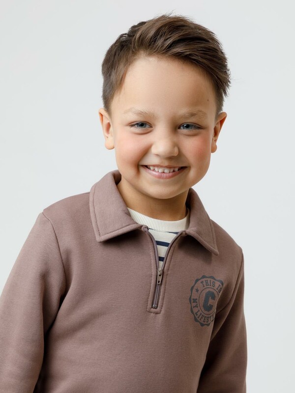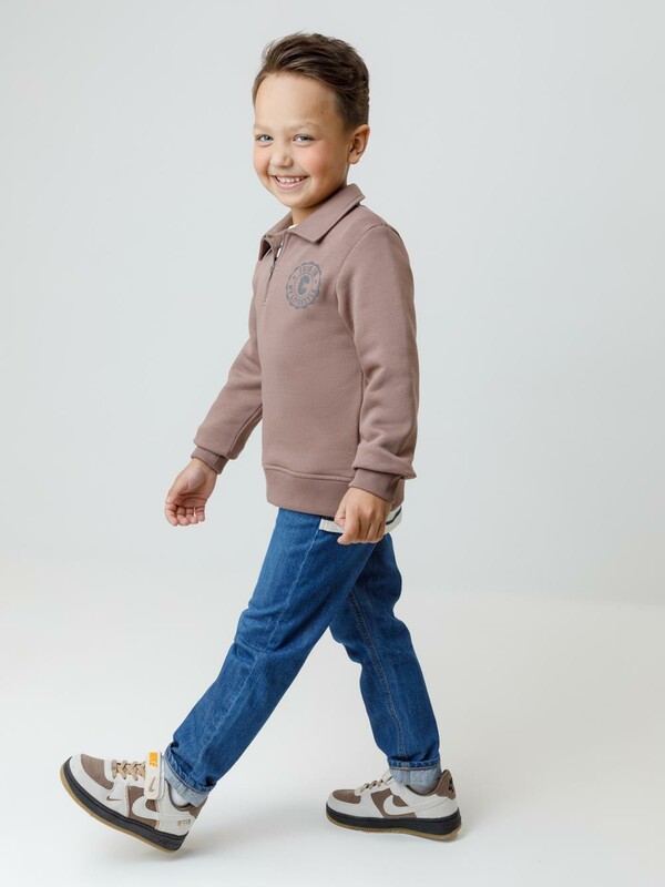 Свитшот с воротником для мальчика. Изготовлен из высококачественного петельчатого футера. В составе 80% натурального хлопка и 20% полиэстера, при этом полиэстер ввязан внутрь по особой технологии и не соприкасается с кожей. Манжеты и пояс выполнены из эластичного полотна. На груди короткая застёжка на молнию. Оригинальный принт выполнен из стойких текстильных гипоаллергенных красителей. Изделие сохраняет цвет и форму после многократных стирок.