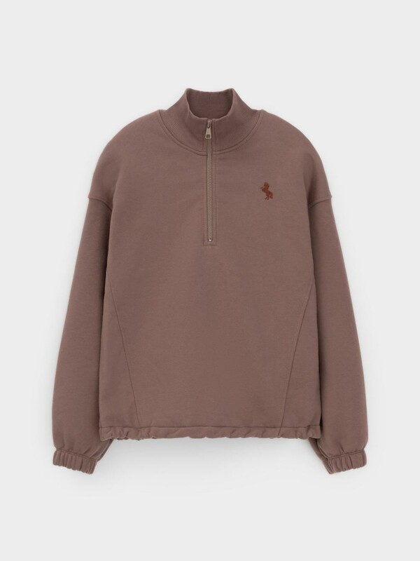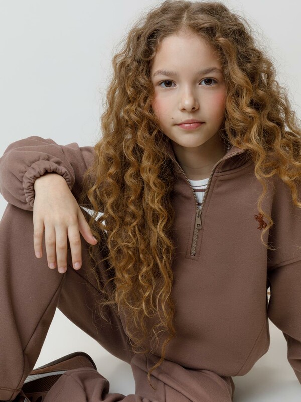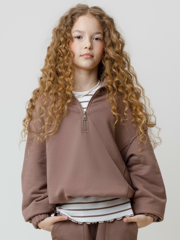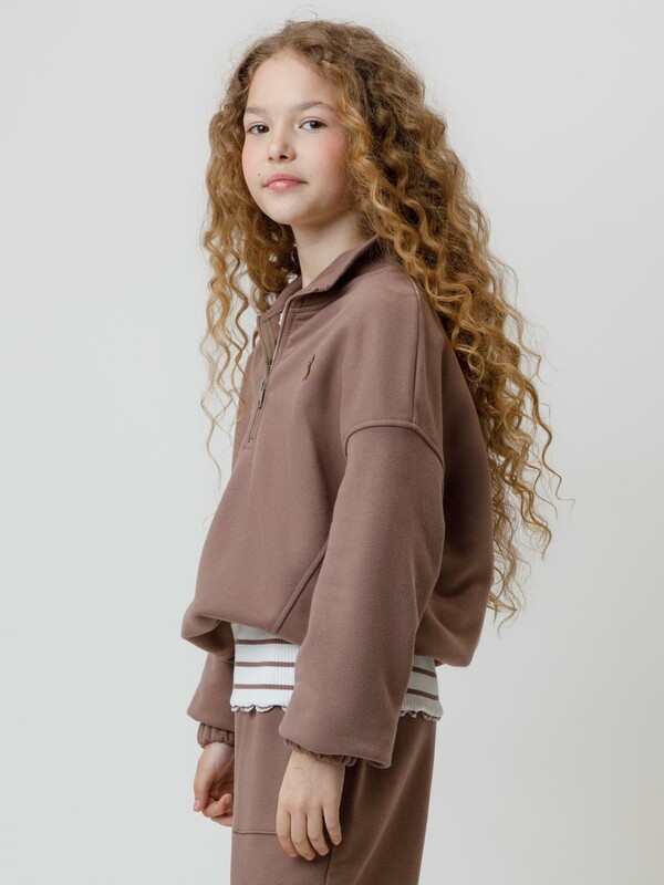 Мягкий свитшот с вышивкой для девочки. Изготовлен из высококачественного футера петли трёхнитки. Спереди застёгивается на короткую металлическую молнию. Воротник выполнен из эластичного полотна в рубчик. Рукава со спущенными плечами и низ изделия собраны на резинку. Свитшот сохраняет форму и стойкий цвет после многочисленных стирок и идеально подходит на каждый день. Все трикотажные полотна производятся в соответствии с нормами швейцарского сертификата ЭкоТекс.