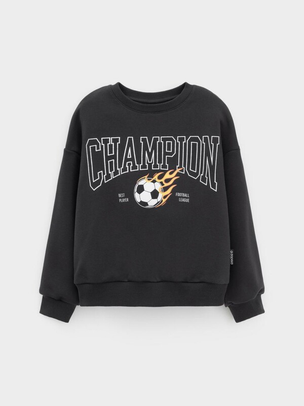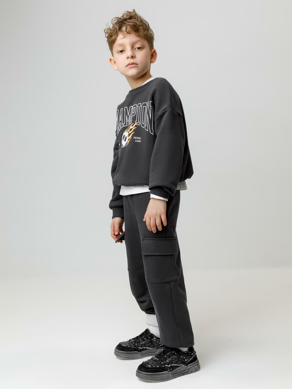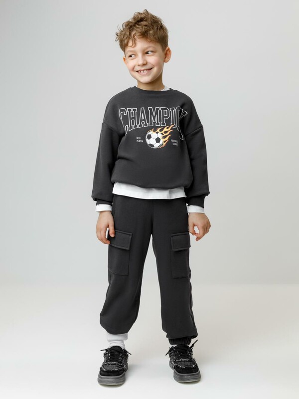 Свитшот для мальчика из высококачественного петельчатого футера. В составе 80% натурального хлопка и 20% полиэстера, при этом полиэстер ввязан внутрь по особой технологии и не соприкасается с кожей. Обтачка горловины, манжеты и пояс выполнены из эластичного полотна. Для удобства одевания имеется застёжка на кнопки в размерах 92 и 98. Оригинальный принт нанесён с помощью стойких текстильных гипоаллергенных красителей.