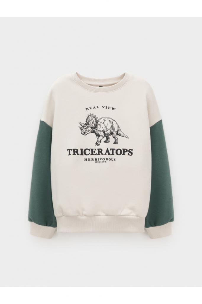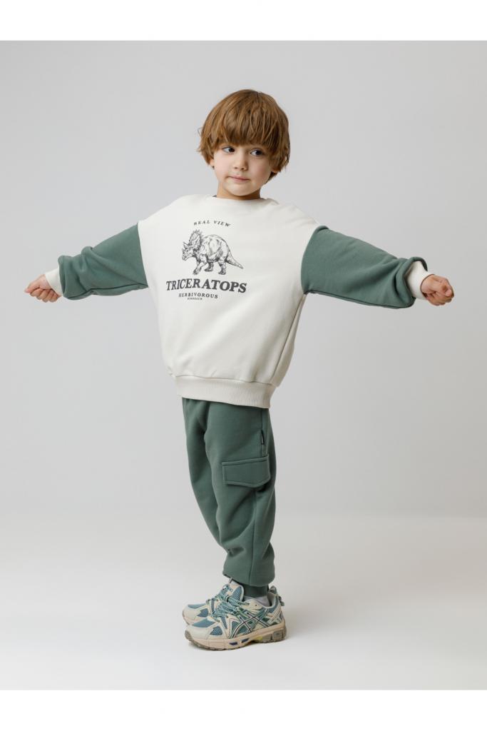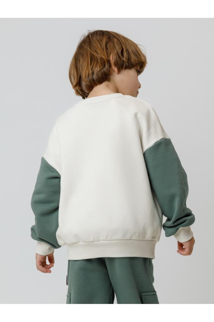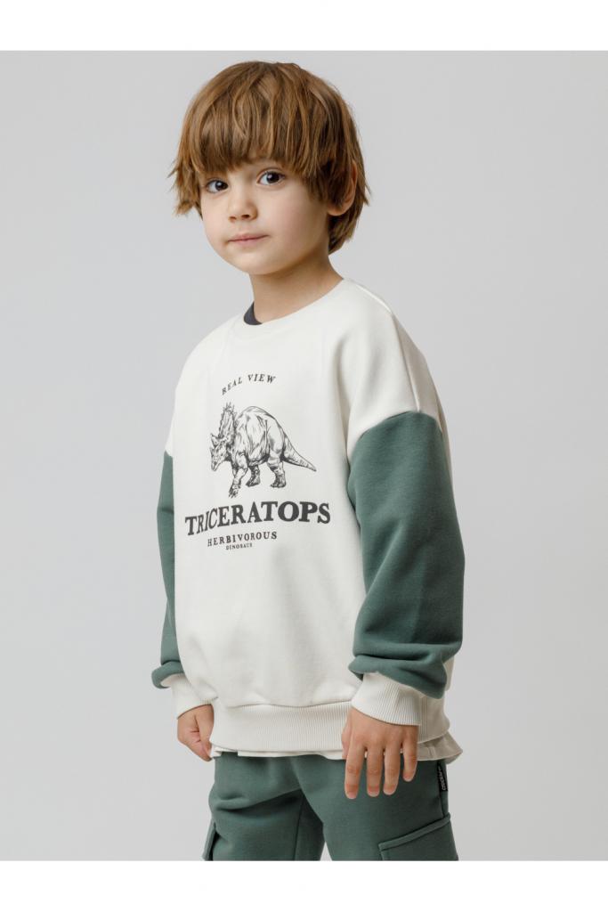 Свитшот для мальчика из высококачественного петельчатого футера трёхнитки. В составе 80% натурального хлопка и 20% полиэстера, при этом полиэстер ввязан внутрь по особой технологии и не соприкасается с кожей. Обтачка горловины, манжеты и пояс выполнены из эластичного полотна. Для удобства одевания имеется застёжка на кнопки в размерах 92 и 98. Оригинальный принт нанесён с помощью стойких текстильных гипоаллергенных красителей.