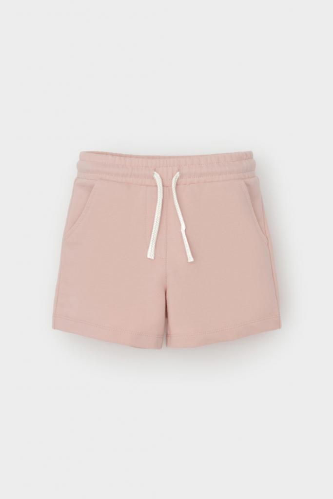 Трикотажные шорты для девочки из петельчатого футера. Эластичный пояс на резинке регулируется по ширине с помощью шнурка, по бокам два удобных кармана.