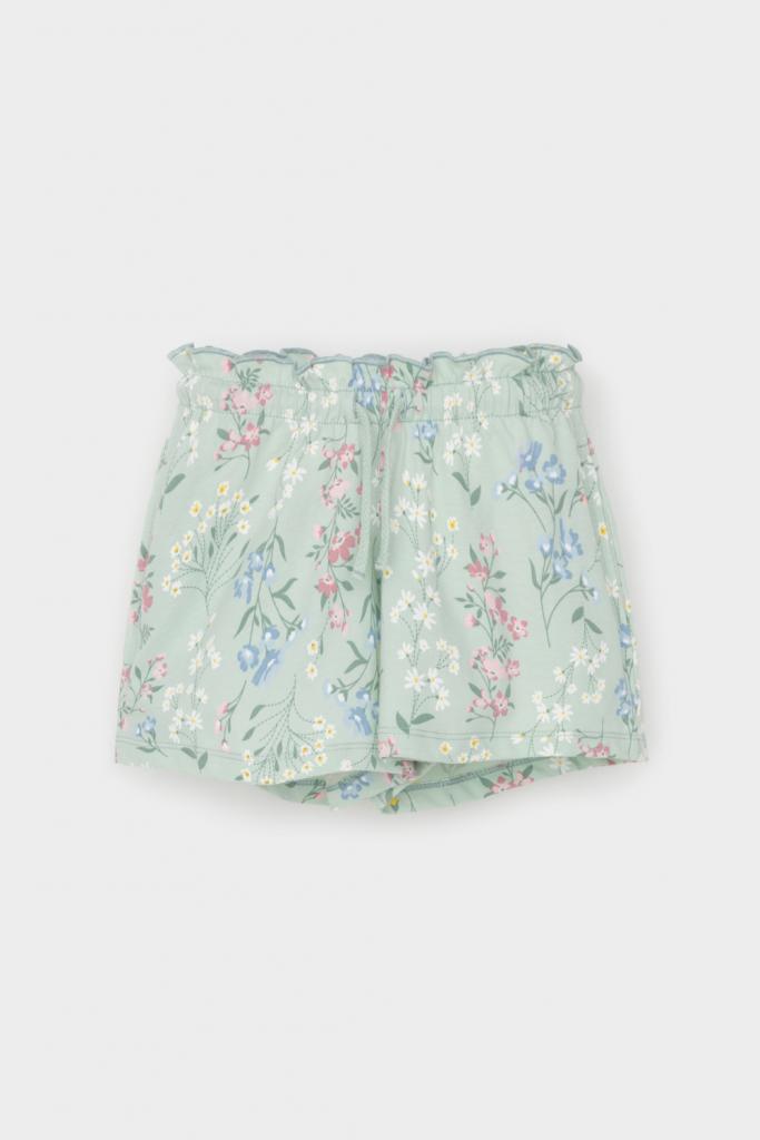 Легкие трикотажные шорты для девочки из высококачественного хлопка. Эластичный пояс регулируется при помощи шнурка.