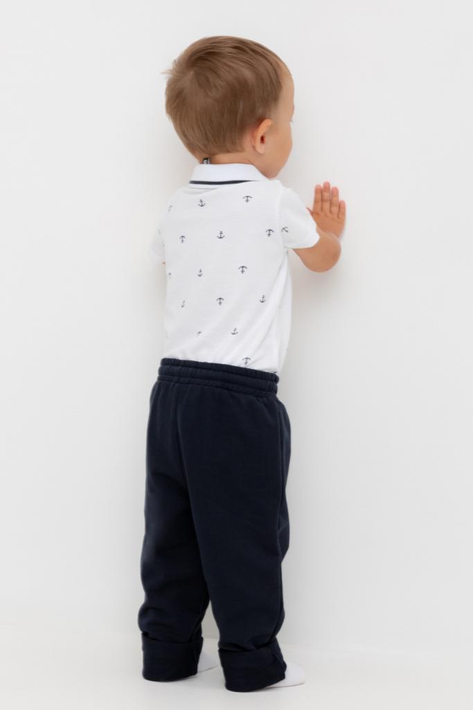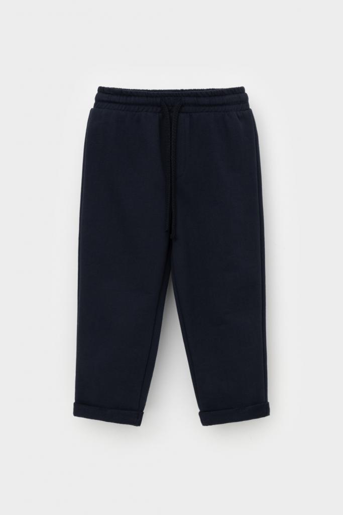 Трикотажные брюки для мальчика из меланжевого петельчатого футера. Эластичный пояс на резинке регулируется по ширине с помощью шнурка, внизу отвороты.