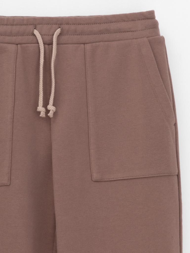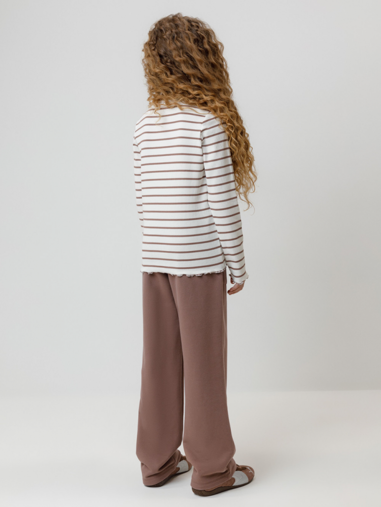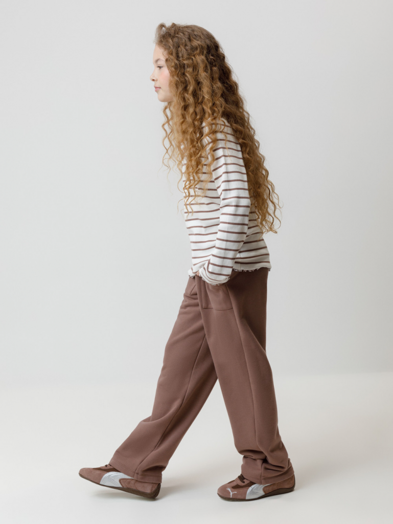 Прямые брюки для девочки из мягкого петельчатого трикотажа. Эластичный пояс на резинке регулируется по ширине с помощью шнурка. По бокам два удобных накладных кармана. Изделие сохраняет цвет и форму после многократных стирок. Все трикотажные полотна производятся в соответствии с нормами швейцарского сертификата ЭкоТекс.