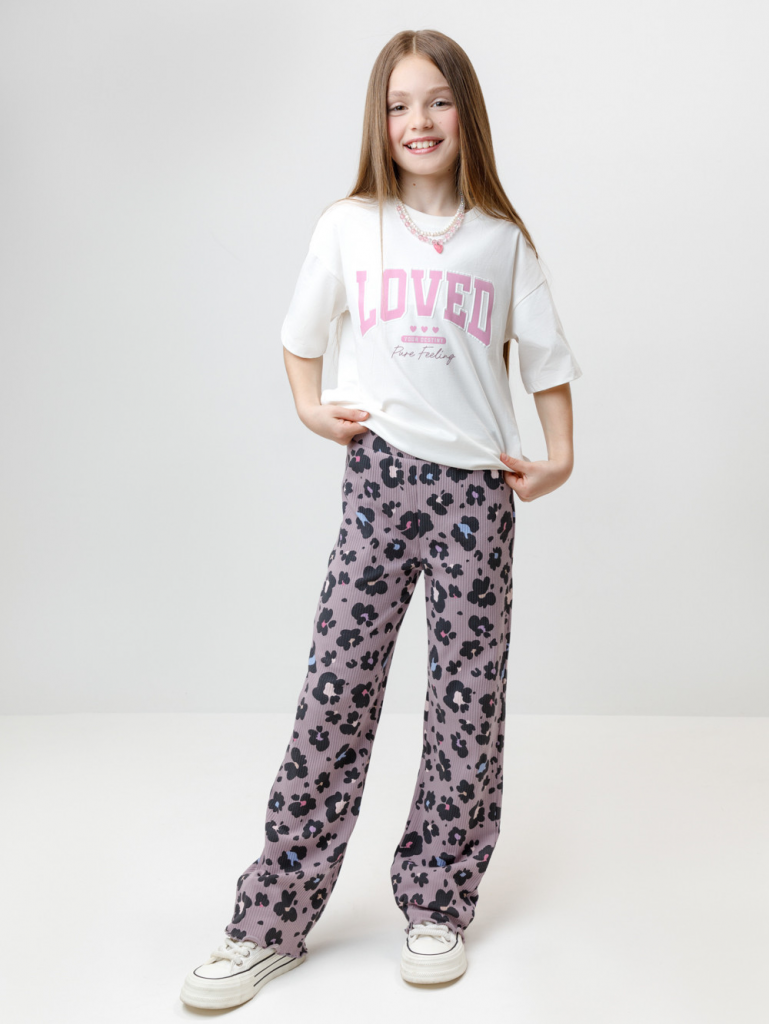 Брюки из эластичного трикотажа в рубчик для девочки. Мягкий пояс на резинке идеально садится по фигуре. Оригинальный рисунок выполнен из стойких текстильных гипоаллергенных красителей. Изделие сохраняет цвет и форму после многократных стирок. Все трикотажные полотна производятся в соответствии с нормами швейцарского сертификата ЭкоТекс.