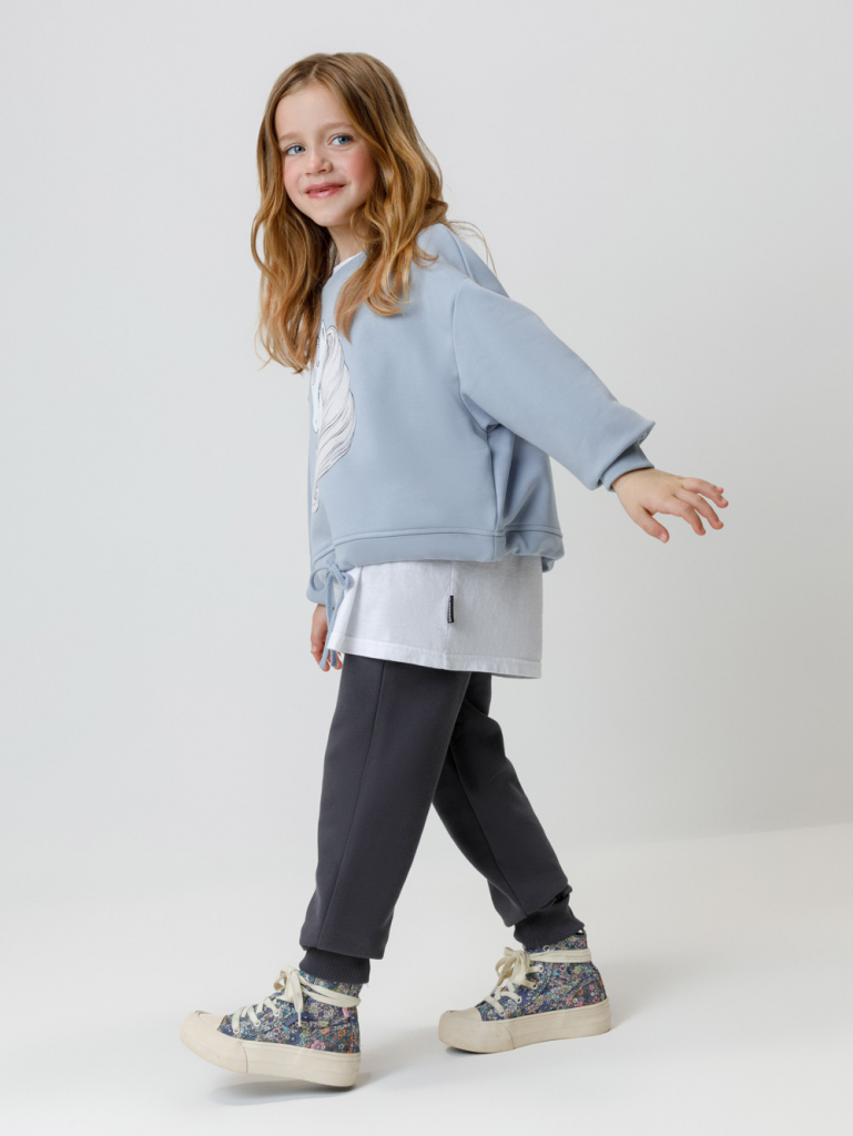 Брюки для девочки из мягкого петельчатого футера. В составе 80% натурального хлопка и 20% полиэстера, при этом полиэстер ввязан внутрь по особой технологии и не соприкасается с кожей. Модель с эластичным поясом на резинке регулируется по ширине с помощью шнурка. Низ на манжетах. Два кармана по бокам. Все трикотажные полотна производятся в соответствии с нормами швейцарского сертификата ЭкоТекс.