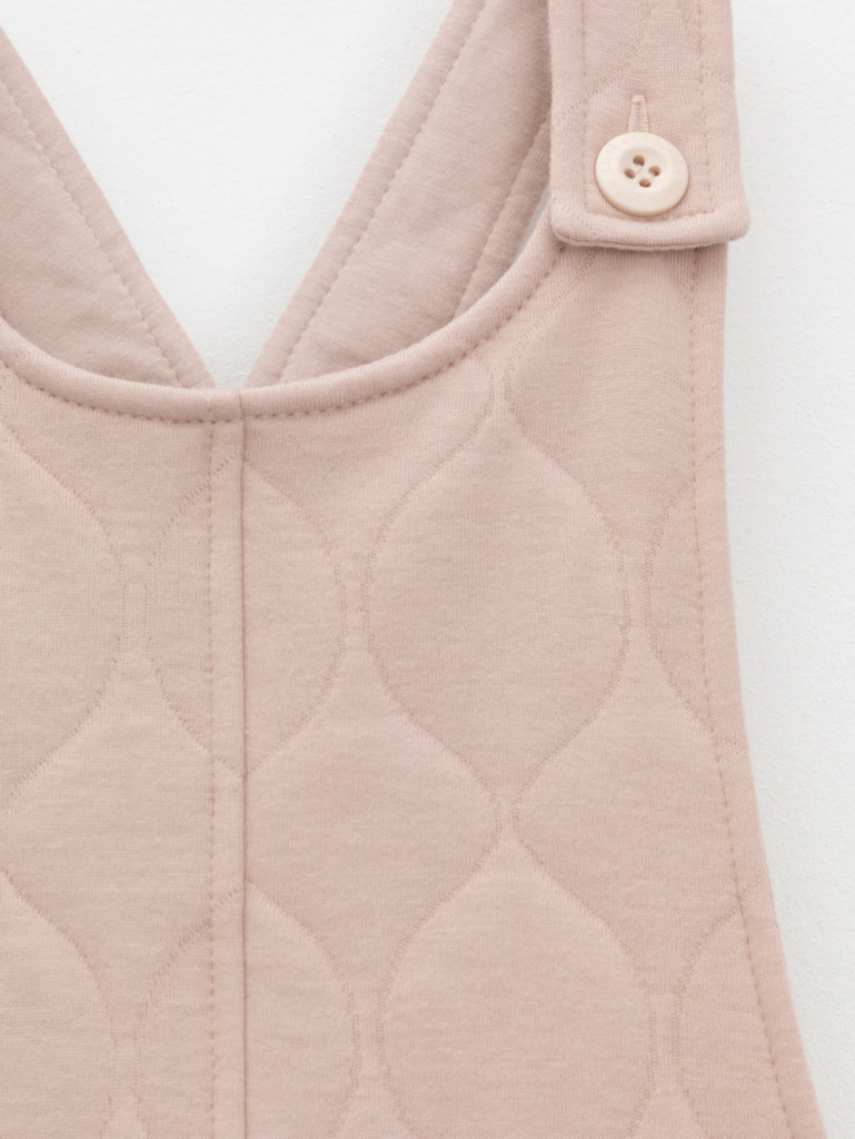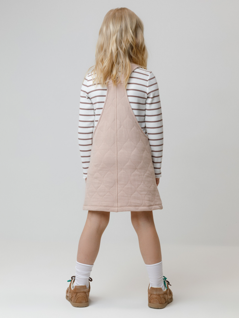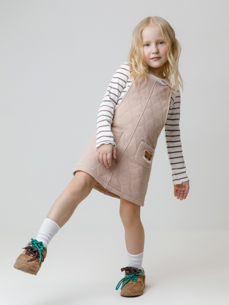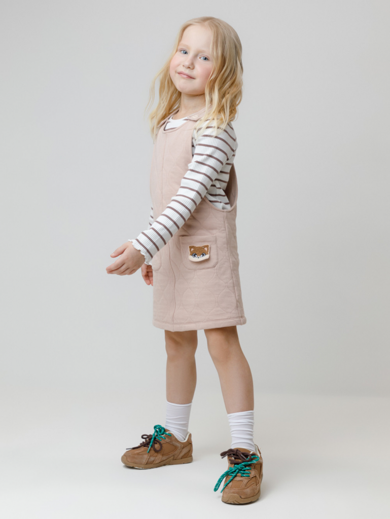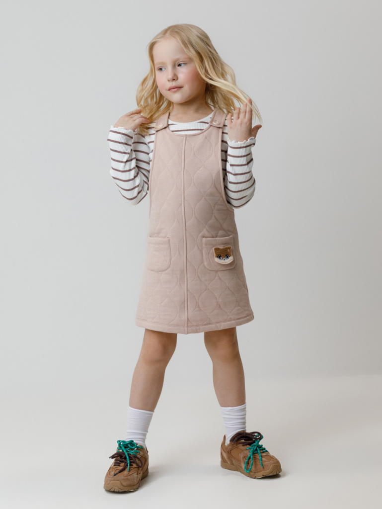 Сарафан на лямках из капитония с двумя накладными карманами. Капитоний – это стёганое трикотажное полотно с утеплителем из полиэстеровой нити. Лямки застегиваются на пуговицы. Все трикотажные полотна производятся в соответствии с нормами швейцарского сертификата ЭкоТекс.