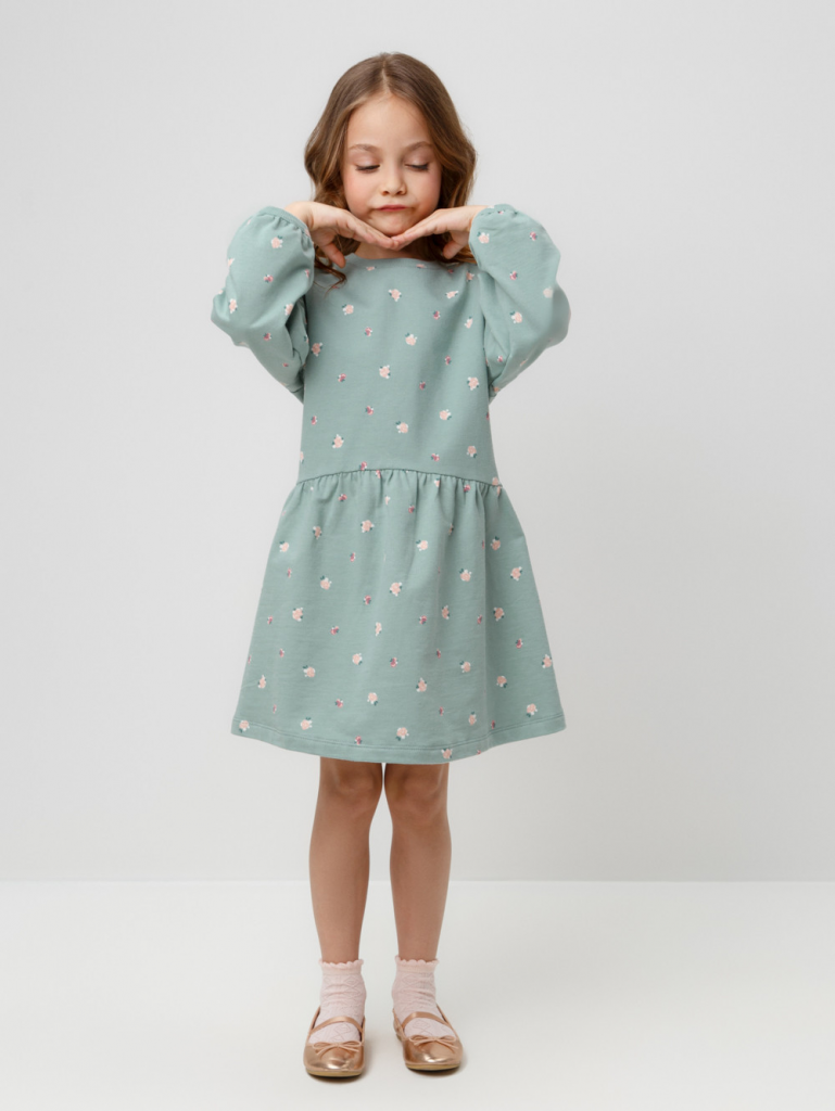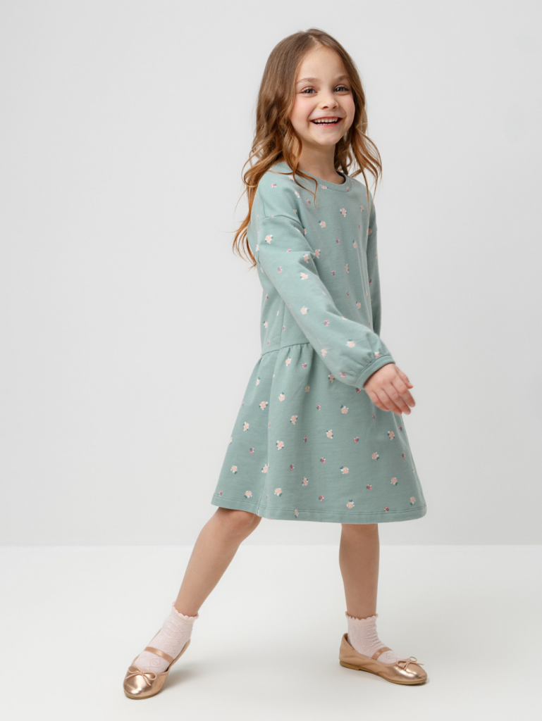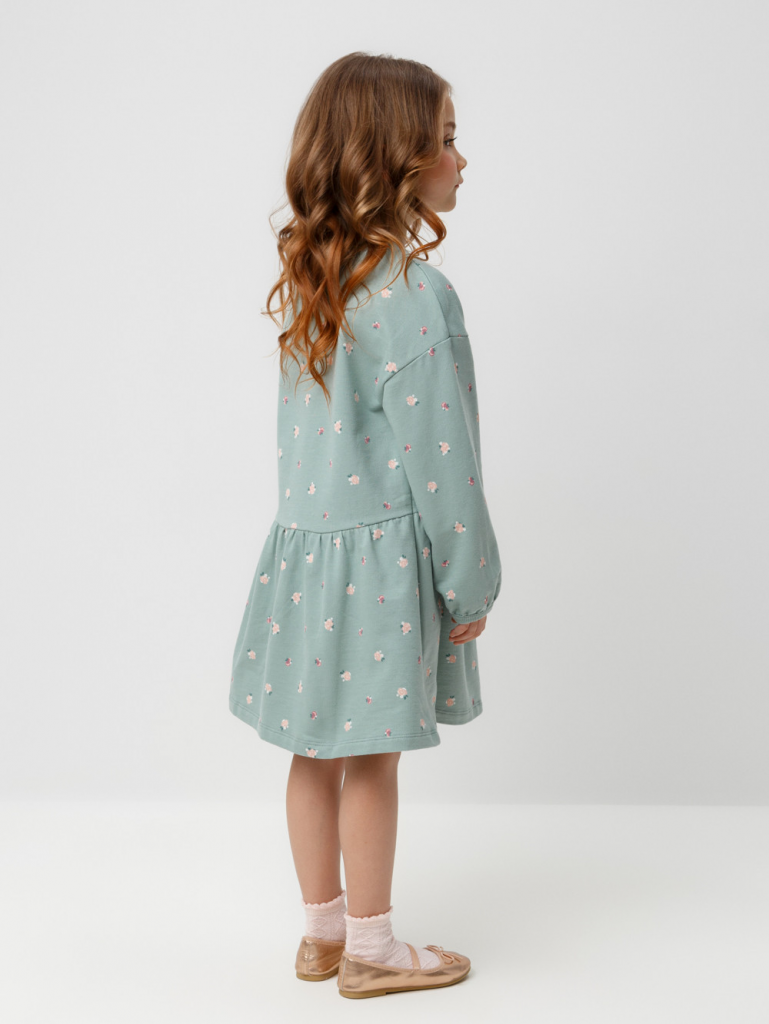 Платье для девочки с длинными рукавами из мягкого петельчатого трикотажа. Для удобства одевания в 98 размере платье застёгивается на кнопки спереди. Платье сохраняет форму и стойкий цвет после многочисленных стирок и идеально подходит на каждый день.
