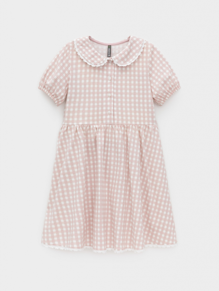 Платье с воротничком для девочки. Изготовлено из высококачественного гладкого трикотажа, произведённого из натурального хлопка. Застёгивается спереди на кнопки и украшено кружевом. Оригинальный рисунок выполнен из стойких текстильных гипоаллергенных красителей. Изделие сохраняет цвет и форму после многократных стирок. Все трикотажные полотна производятся в соответствии с нормами швейцарского сертификата ЭкоТекс.