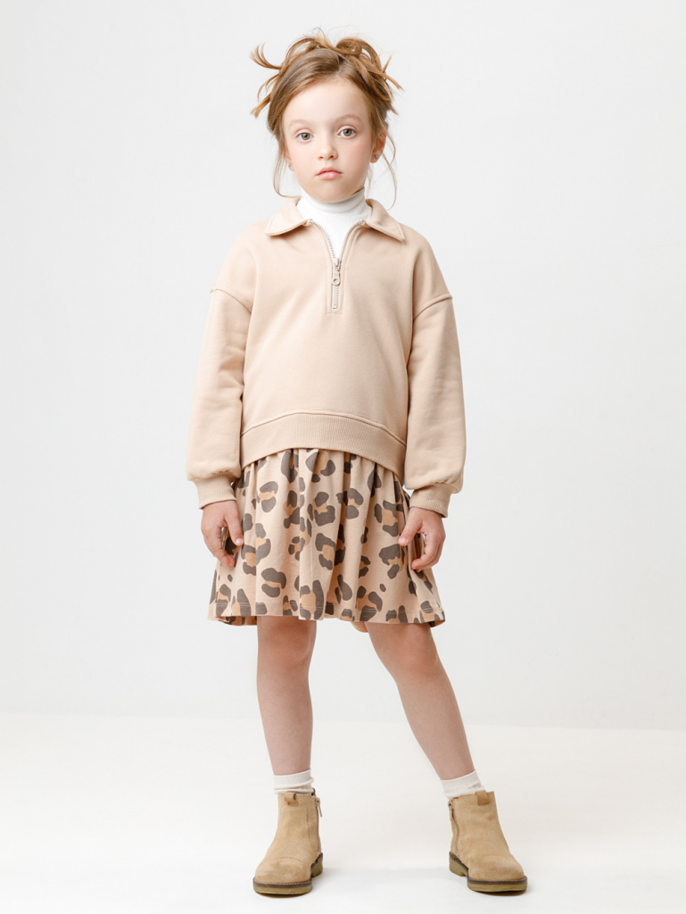 Платье для девочки с длинными рукавами и воротничком. Изготовлено из мягкого петельчатого трикотажа и украшено оборкой из гладкого материала супрем. Спереди застёжка на короткую молнию. Платье сохраняет форму и стойкий цвет после многочисленных стирок и идеально подходит на каждый день. Оригинальный принт выполнен из стойких текстильных гипоаллергенных красителей. Все трикотажные полотна производятся в соответствии с нормами швейцарского сертификата ЭкоТекс.