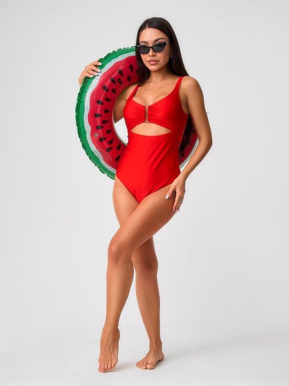 Слитный купальник на подкладе из эластичного полотна с мягкой формованной чашкой soft bra. Мягкая чашка с формованными съемными вкладышами. Без каркасов и без боковых корсетных вставок.Спереди декоративная металлическая вставка. Бретели несъемные и нерегулируемые. Без застежки. Тонкие резинки, подгиб и плоский шов по срезу ножек