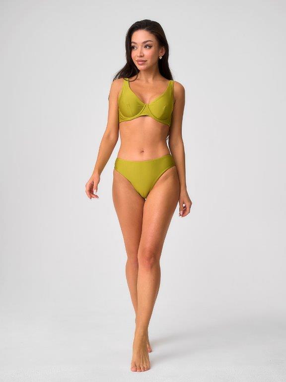 Раздельный купальник на подкладе из блестящего эластичного полотна изысканного цвета Шартрез состоит из бюстгальтера и плавок. Бюстгальтер с мягкой чашкой на подкладе, на каркасах и с боковыми корсетными вставками. Широкач бретель впереди переходит в регулируемую более тонкую на спинке. Застегивается на пластиковую застежку. Плавки на подкладе о средней посадкой