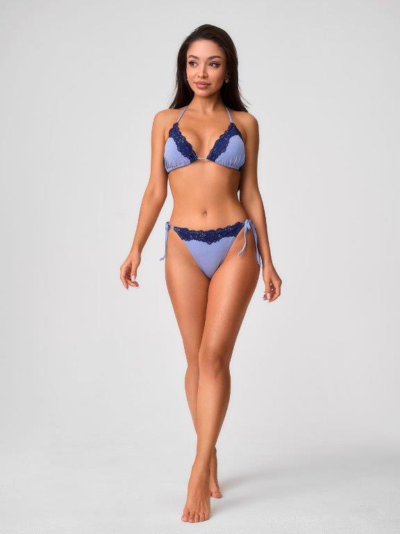 Раздельный купальник из эластичного полотна с блеском и кружевом на подкладе с мягкой чашкой soft bra. Бюстгальтер с мягкой чашкой, со съемными формованными вкладышами. Без каркасов и без боковых корсетных вставок. Верхняя линия чашек декорирована мягким кружевом. Бретели и застежка на завязках. Плавки на подкладе,с завышенной талией. По бокам декоративные завязки. По линии талии декоративное мягкое кружево. Тонкая резинка, подгиб и плоский шов по талии и срезу ножек.