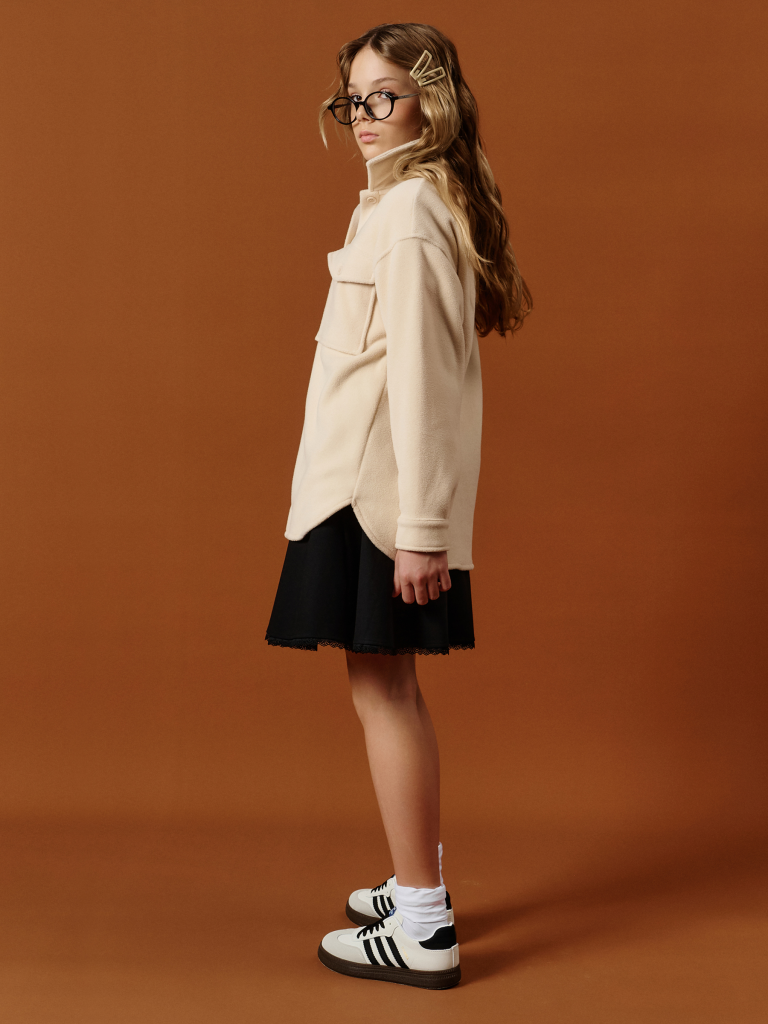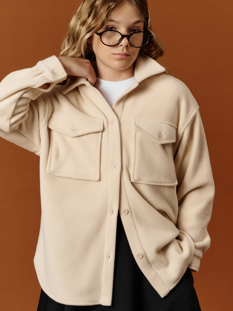 Рубашка для девочки из флиса. Куртка модного оверсайз-силуэта со спущенным плечом подарит ребёнку комфорт и свободу движения. Классическая застёжка на пуговицы. Стильно и практично. Манжеты рукавов застегиваются на пуговицу. Накладные карманы с клапаном застугиваются на пуговицу — удобно пользоваться. Модель однотонная, без принта. Изделие неприхотливо в уходе. Одежда из флиса тёплая, лёгкая, мягкая, просто стирается и быстро сохнет, не выгорает и не скатывается, сохраняет первозданную форму в течение длительного времени. Толстовку можно носить девочкам в садик и подросткам в школу. Рубашку можно носить круглогодично: летом, осенью, зимой, весной и в демисезон.