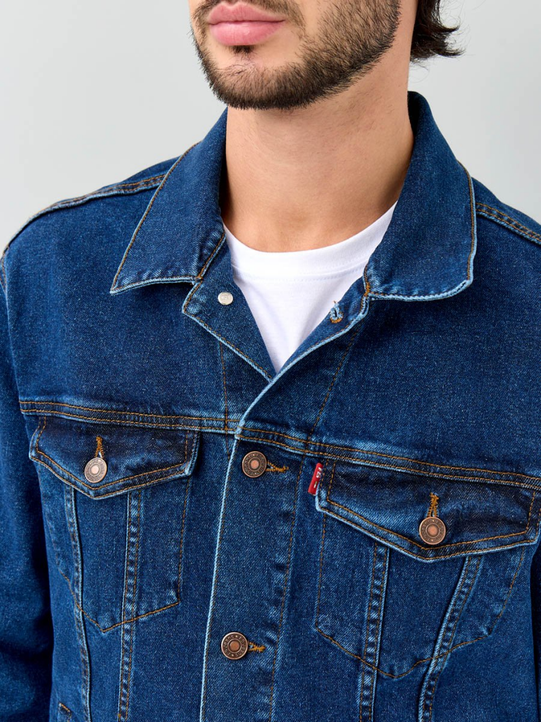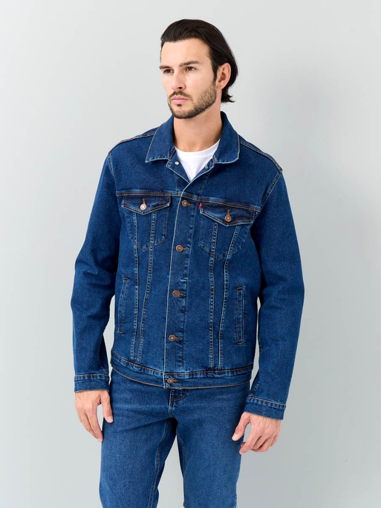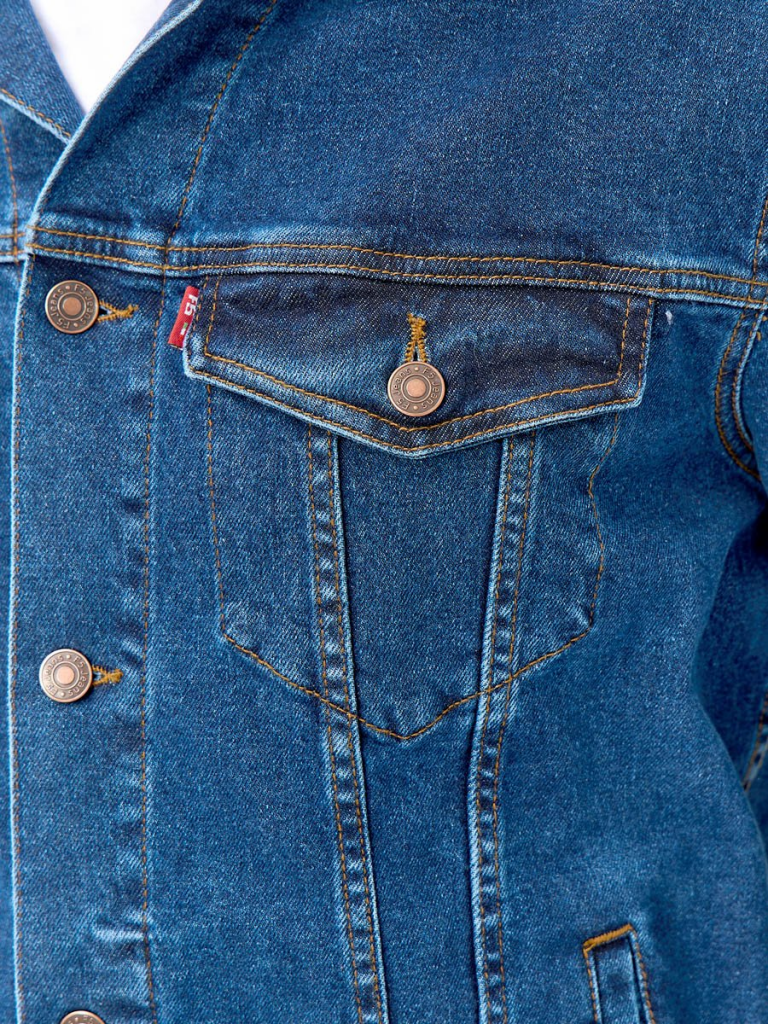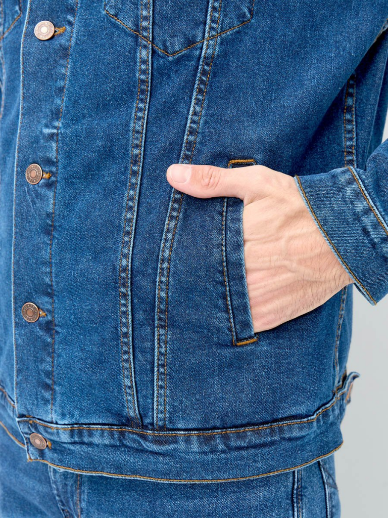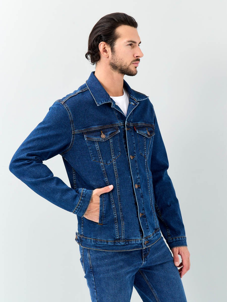 на поясе по бокам куртки хлястик и две пуговицы, которые позволяют регулировать длину обхвата по поясу. Выполнена из неэластичной традиционной плотной ткани denim. Классическая темная стирка с потертостями спереди и сзади, а также по швам.