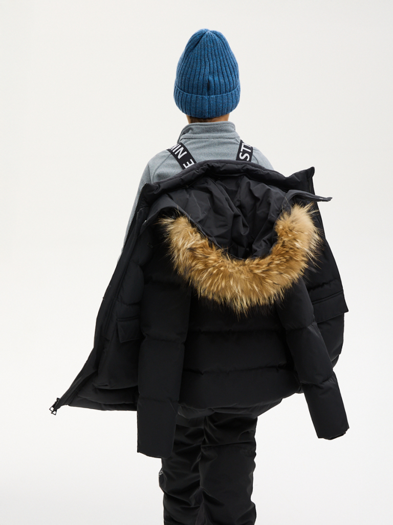 Брендированная пуходержащая подкладка с технологией OMNI-HEAT за счет металлизированных частиц алюминиевой фольги отражает тепло, исходящее от тела, не позволяя ему выходить за пределы изделия, при этом отводя излишки влаги, обеспечивая комфортную эксплуатацию. Съемный капюшон на кнопках с опушкой из натурального меха енота.
