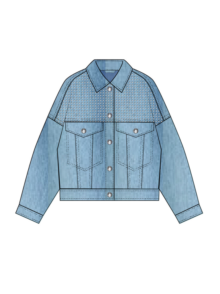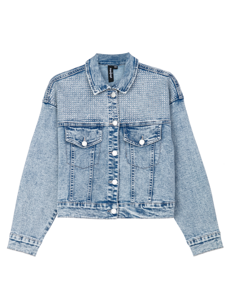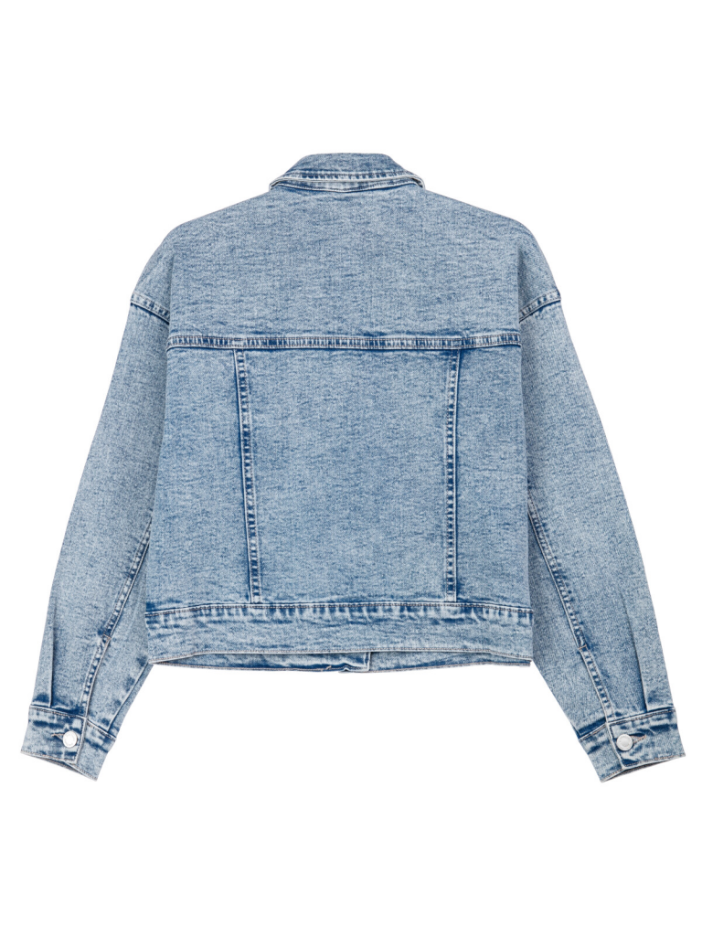 Куртка джинсовая из эластичного денима. Свободная посадка. Средняя длина. Застежка на болты. Функциональные карманы.