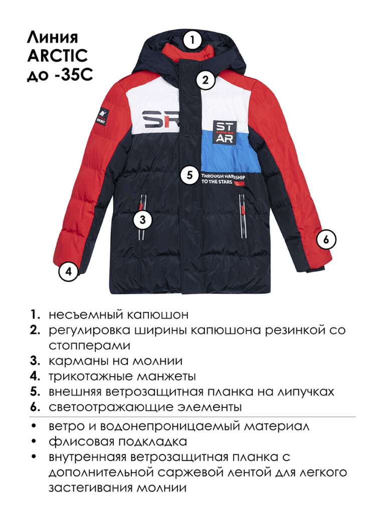 Куртка зимняя. Линия Arctic - одежда для активного отдыха, рекомендована для низких температурных режимов (до -35C). Материал верха с ветрозащитным и водоотталкивающим покрытием. Внутренняя и внешняя ветрозащитные планки. Два боковых кармана на липучке. Внутренний карман. Подкладка - флис. Несъемный капюшон регулируемый резинкой со стопперами. Эластичный манжет по низу рукава. Застежка на молнию с двойным ходом. Текстильный клапан для защиты подбородка при застегивании молнии. Светоотражающие элементы. *температурный режим является рекомендованным, необходимо учитывать уровень активности ребенка и многослойность поддевочной одежды (термобелье, флис).