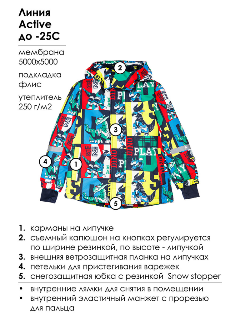 Зимняя детская куртка для мальчика. Особенности модели: Линия Active, Температурный режим до -25С, мембрана 5000х5000, подкладка - флис,Утеплитель 250 г/м, боковые карманы на липучке,съемный капюшон с адаптацией по ширине резинкой,внешняя ветрозащитная планка на липучках,эргономичные рукава, внутренние лямки для снятия в помещении,снегозащитная юбка с резинкой Snow stopper, Утепленная горнолыжная куртка - идеальный выбор для активного отдыха на свежем воздухе в зимний период. Инновационный утеплитель и флисовая подкладка сохраняют тепло морозную погоду.Мембранный материал делает этот яркий и модный комбинезон непромокаемым: мембрана не пропускает влагу снаружи, но выводит её изнутри, что крайне важно во время подвижных игр и занятий спортом. Легкая, теплая и удобная, куртка идеально подходит для спорта, лыж, сноуборда и игр на свежем воздухе в холодный период года: зима, поздняя осень и ранняя весна. *Пожалуйста, обратите внимание, что указанный температурный режим является приблизительным и зависит от многих факторов, таких как возраст, физическое состояние, уровень активности ребенка и количество слоев одежды. Время, проведенное на открытом воздухе, и погодные условия, такие как холодный ветер, могут повлиять на тепловые характеристики изделия. Убедитесь, что защищены от холода голова, руки и ноги.