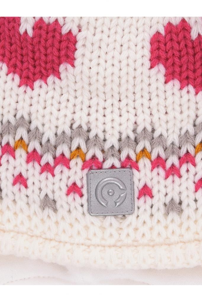 Тёплая зимняя шапка с подкладом из хлопкового трикотажа. Верх выполнен из полушерстяной пряжи. На макушке помпон. Светоотражающая нашивка спереди обеспечивает безопасность в темное время суток.