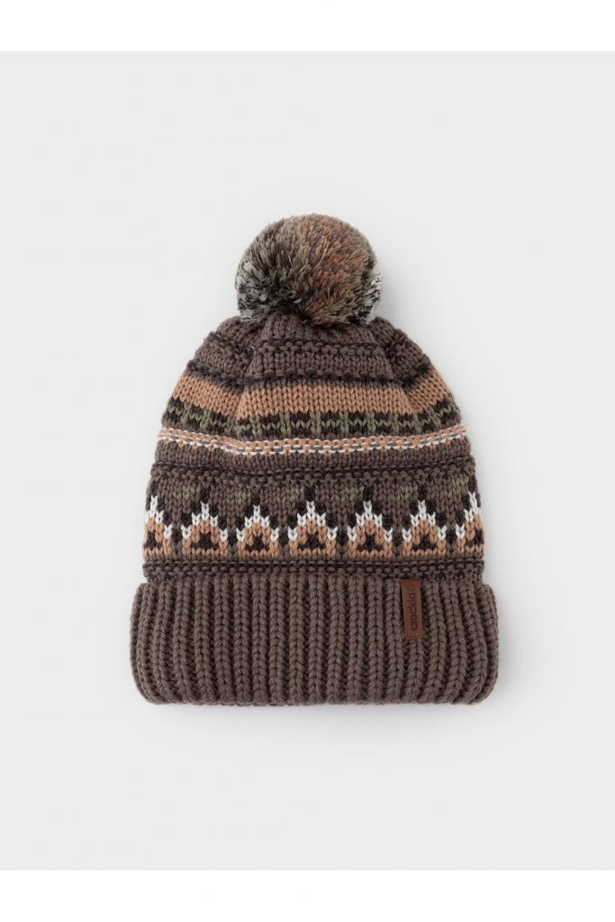 Тёплая зимняя шапка с подкладом из хлопкового трикотажа. Верх выполнен из полушерстяной пряжи. На макушке помпон.