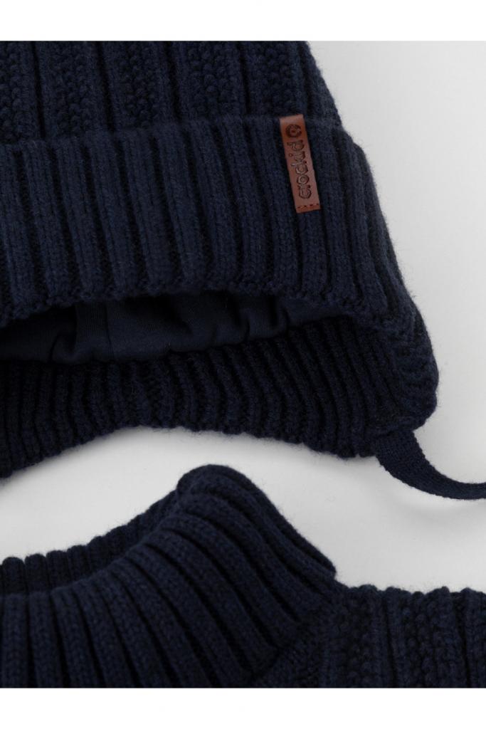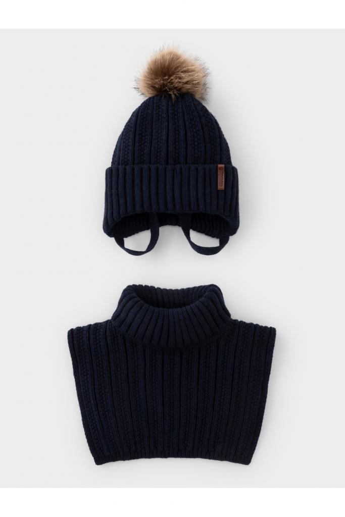 Комплект для мальчика: шапка и манишка из полушерстяной пряжи. Шапка на завязках с синтепоновым утеплителем. Подклад из натурального хлопка. Полностью закрывает голову, уши и шею, защищая ребёнка от холодного воздуха и ветра. На макушке помпон. Манишка с высоким воротником с эластичным отворотом.