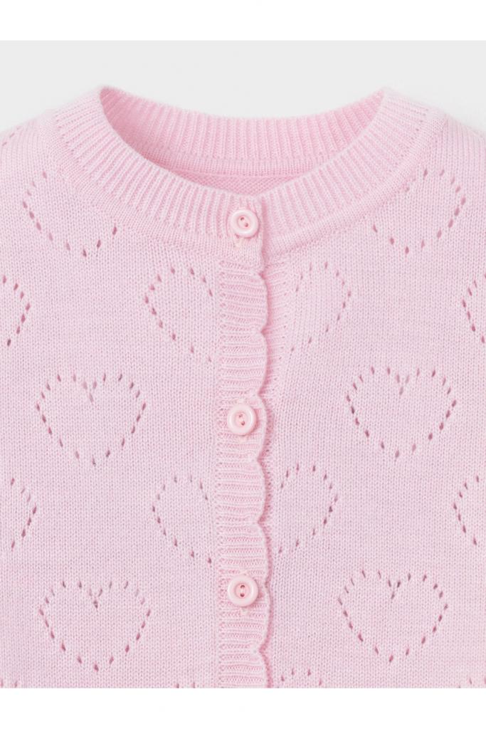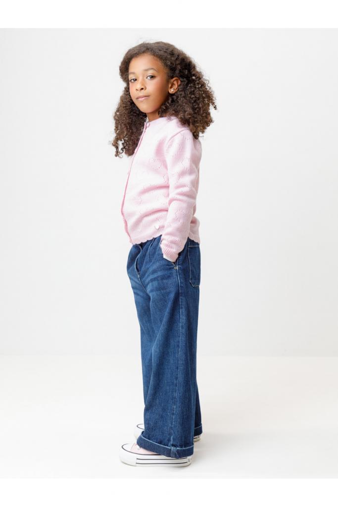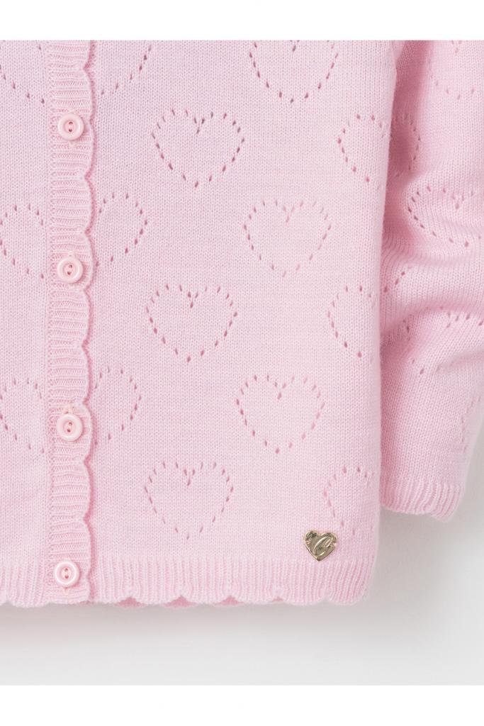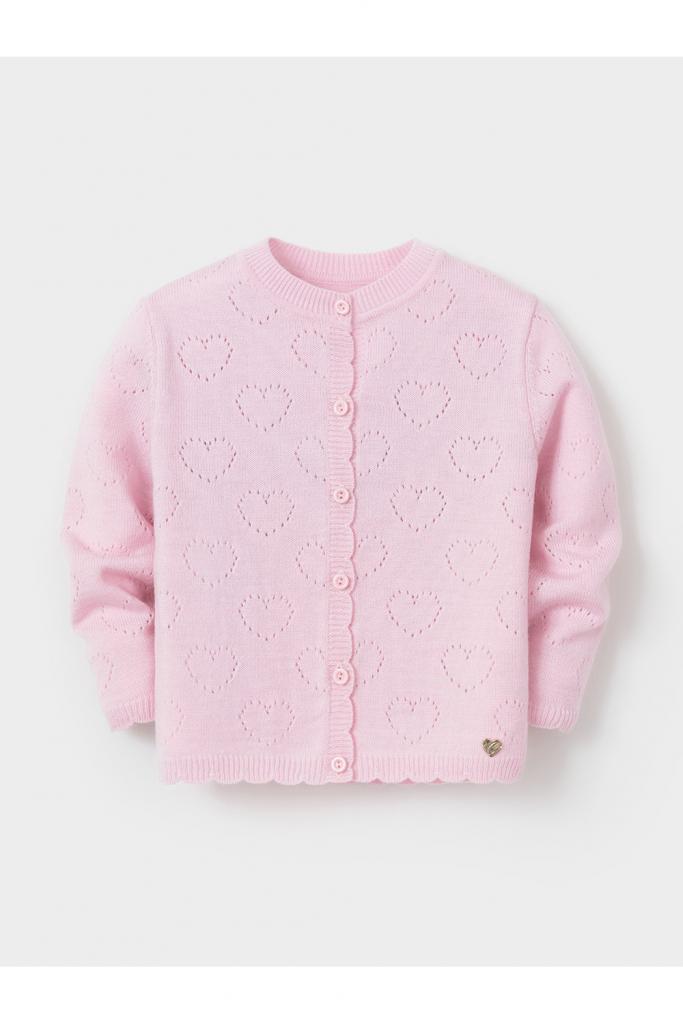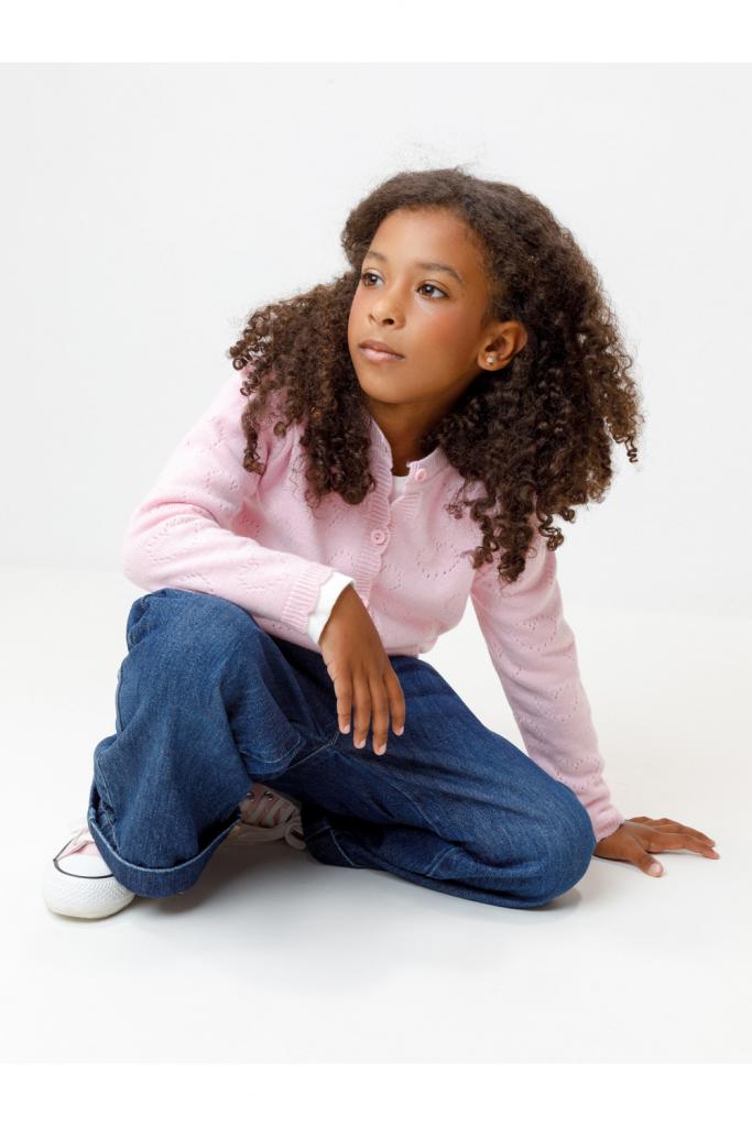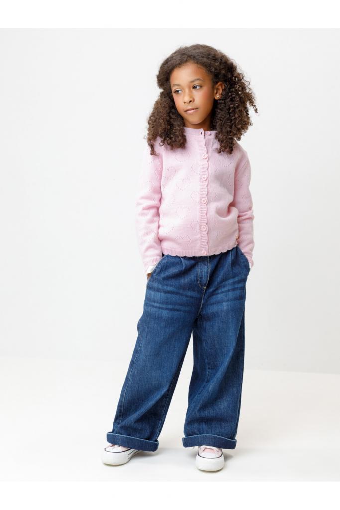 Вязаный кардиган с ажурными сердечками для девочки. Изготовлен из мягкой полушерстяной пряжи. Застёгивается на планку с пуговицами. Длинные рукава, планка и низ изделия с ажурной каймой по краям. Изделие сохраняет форму и стойкий цвет после многочисленных стирок.