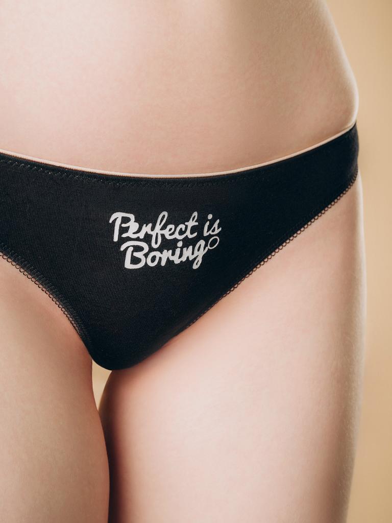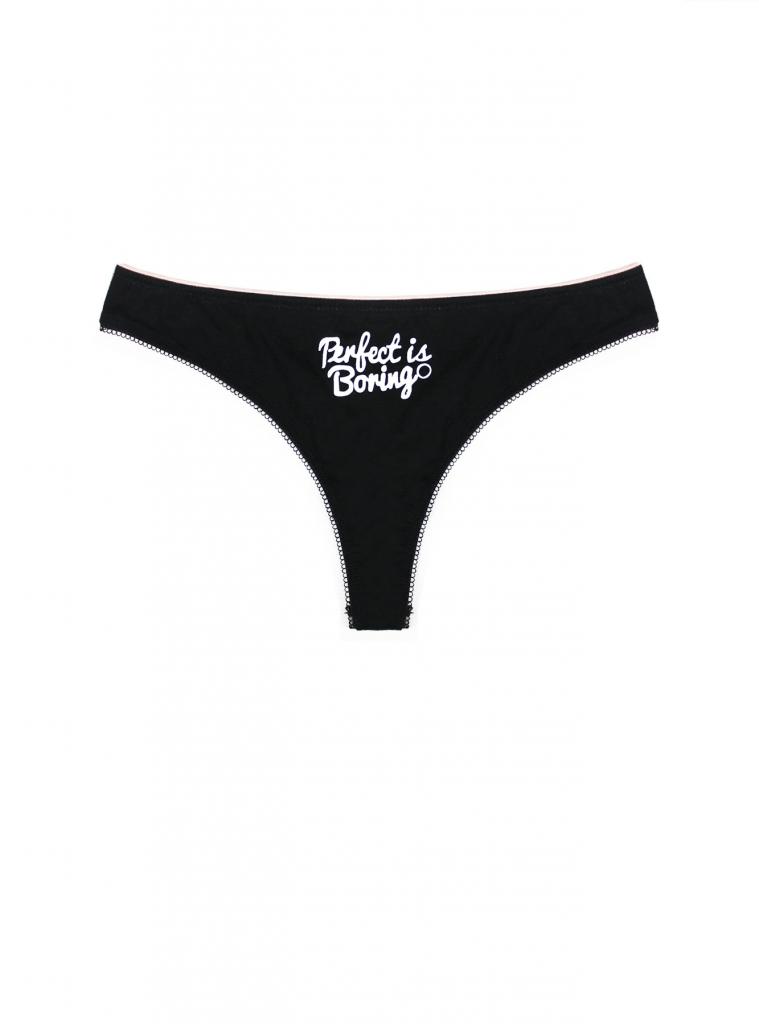 Стринги женские изготовлены из полиэстера и выполнены в классическом черном цвете. Трусы стринги низкой посадки с тонкой эластичной резинкой на талии. Задняя часть трусов выполнена в сетчатой ткани. На внутренней стороне трусов имеется хлопковая ластовица. На трусы нанесен принт в виде надписи «Perfect is Boring».