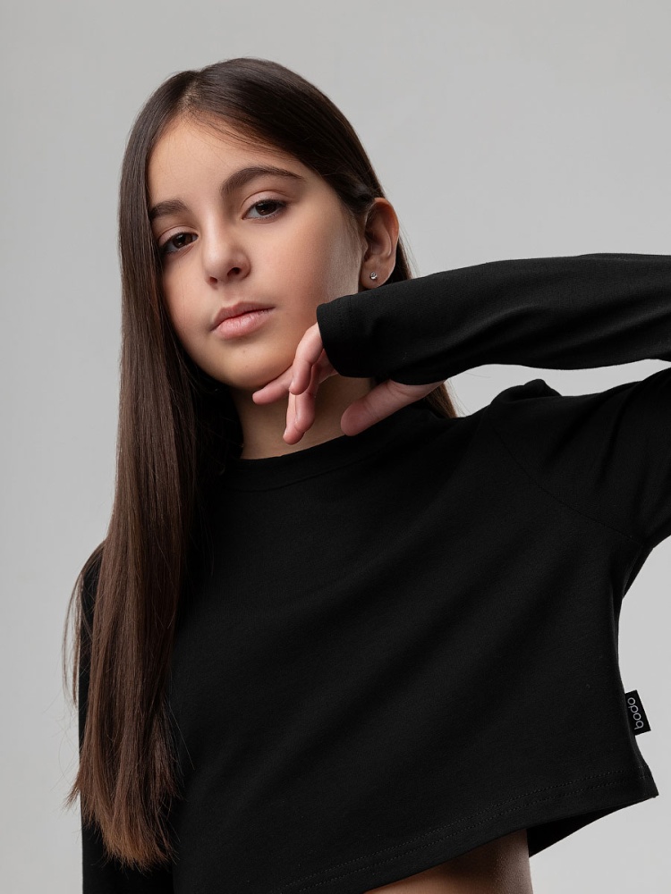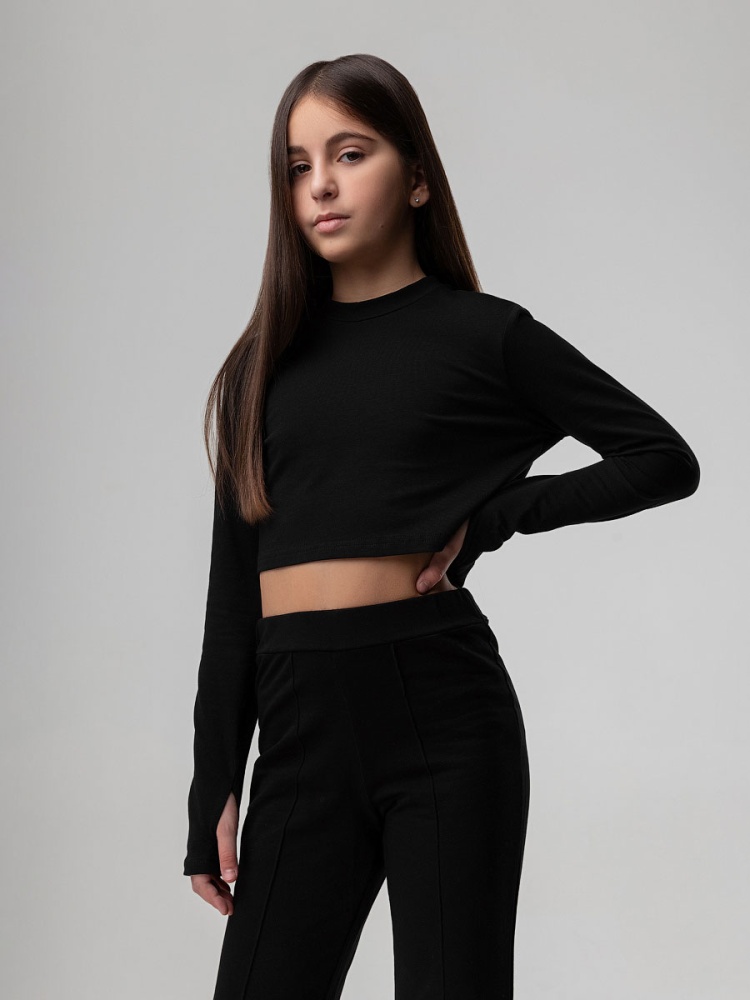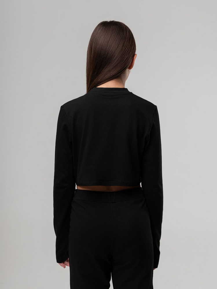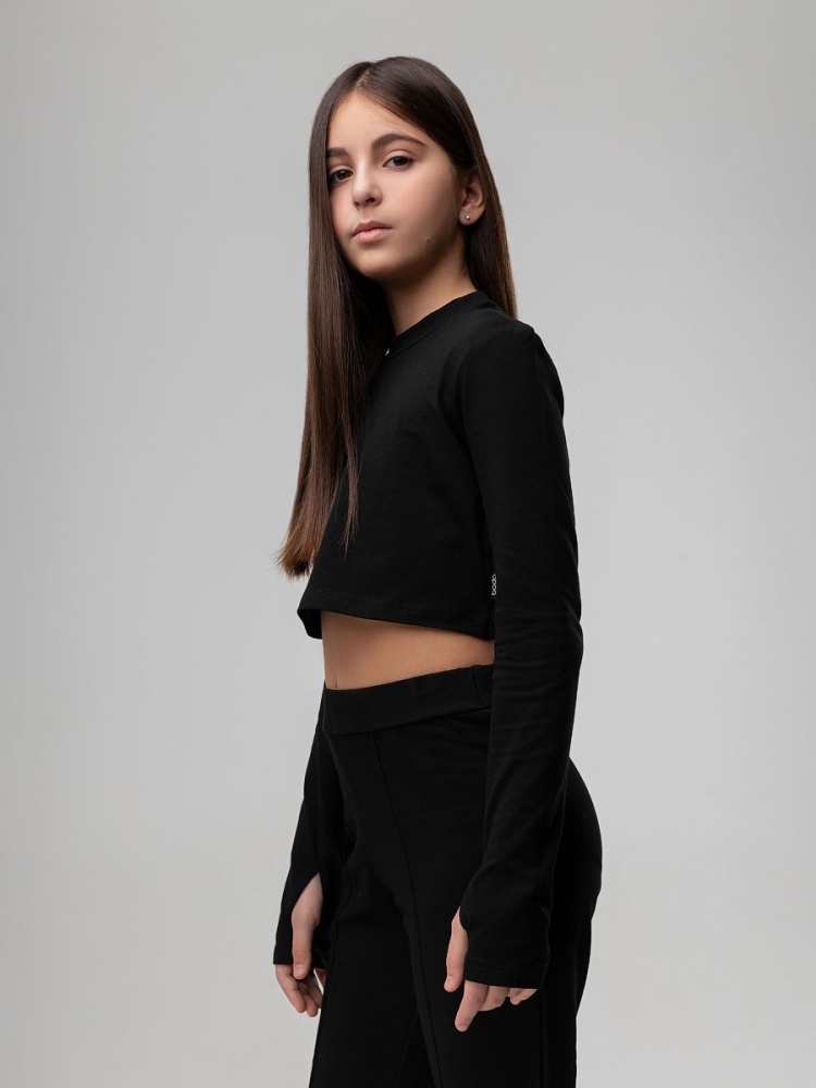 Свободный, укороченный лонгслив с длинным рукавом и отверстием под большой палец. Воротник стойка.