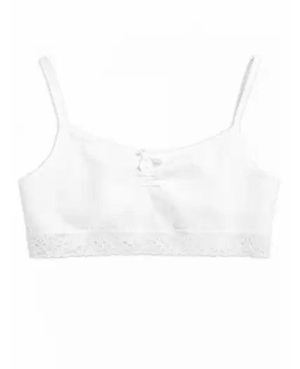 Топ для девочек. Топ на тонких бретелях. Горловина декорирована атласным бантиком. По низу изделия кружевной эластик.
