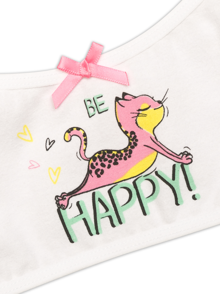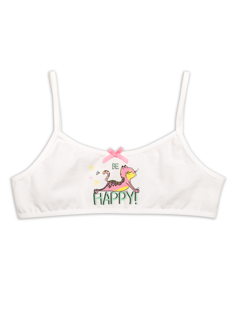Топ для девочки из хлопка на тонких эластичных бретелях, которые плотно прилегают, но не давят и не впиваются. Топ без чашек, декорирован бантиком и мягким принтом, которые придают изделию изысканный и нежный вид. Может носиться как нижнее белье, в качестве одежды для сна или как топ для занятий фитнесом.