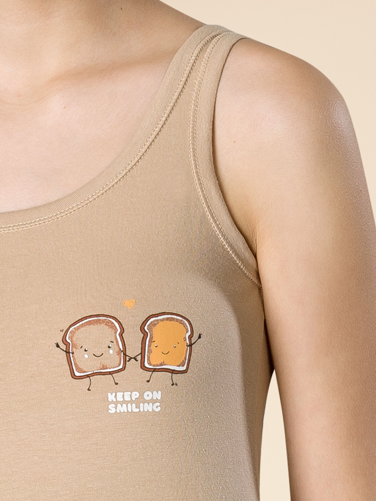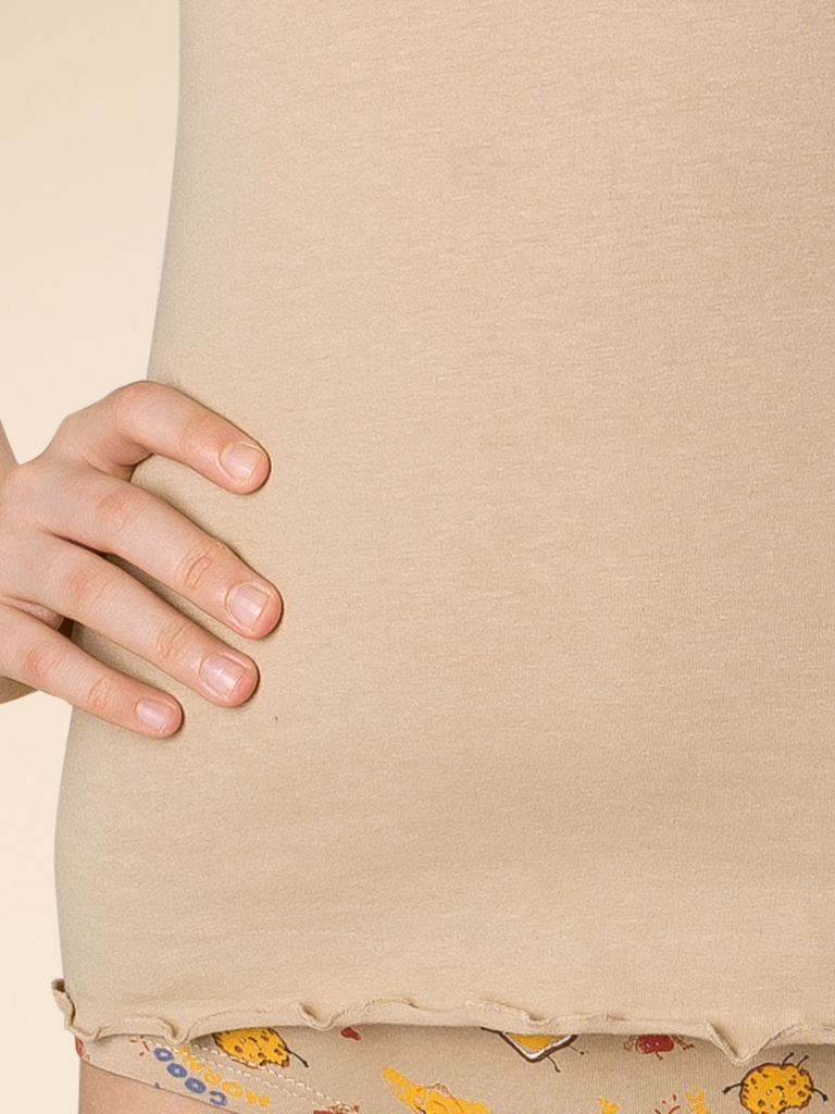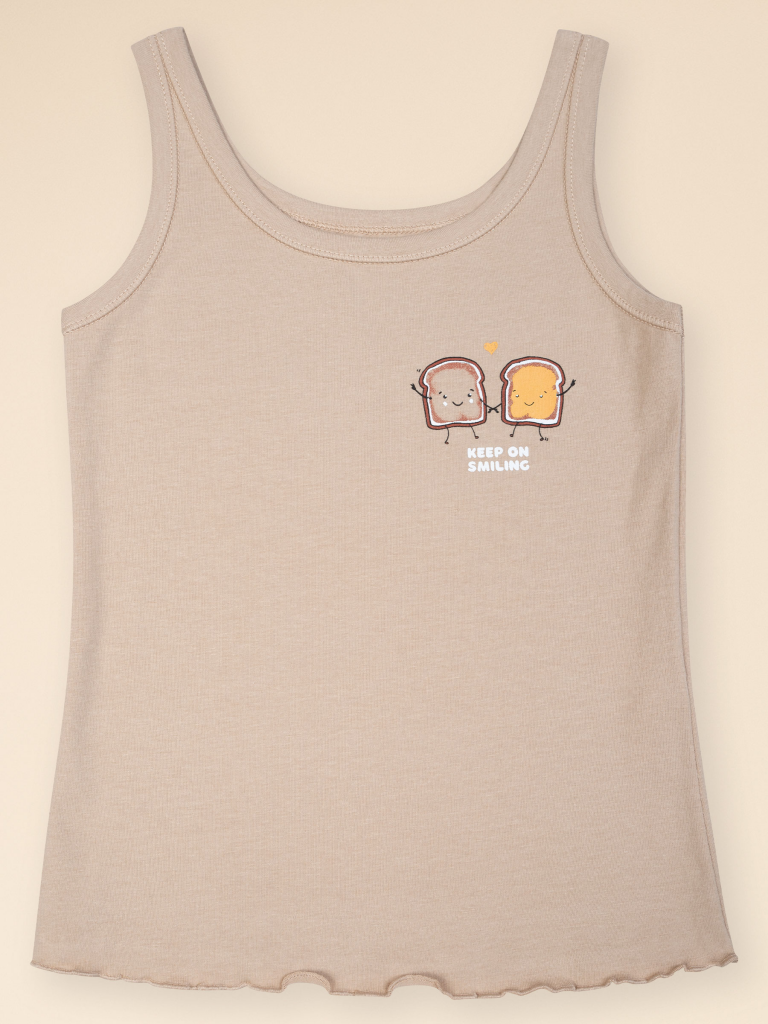 Если вы хотите купить своему ребёнку действительно качественное, красивое и комфортное нижнее бельё, представляем вам нашу нежную и стильную майку для девочки. Модель изготовлена из ткани с высоким содержанием хлопка — она мягкая, превосходно пропускает воздух, давая коже ребёнка дышать. Эластан обеспечивает эластичность и помогает белью сохранять великолепную форму в течение долгого времени, даже при частых стирках. Благодаря высококачественному материалу и аккуратному пошиву майка идеально садится по фигуре — ребёнку удобно в течение всего дня. Горловина и проймы обработаны эластичным пайпингом в тон — они не растягиваются и надолго сохраняют прекрасный внешний вид. Майка выполнена в модном натуральном оттенке "овсяное молоко" и украшена милым лаконичным принтом в стиле "хюгге" с позитивным текстом. Перевод: "Продолжай улыбаться". Принт мягкий и долговечный, замечательно переносит стирки. По низу изделие декорировано отделкой "салатный край", придающей модели изящности. Такая майка — отличный выбор для повс