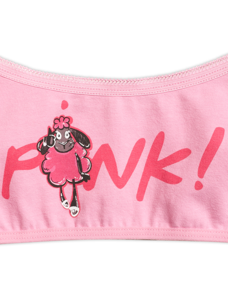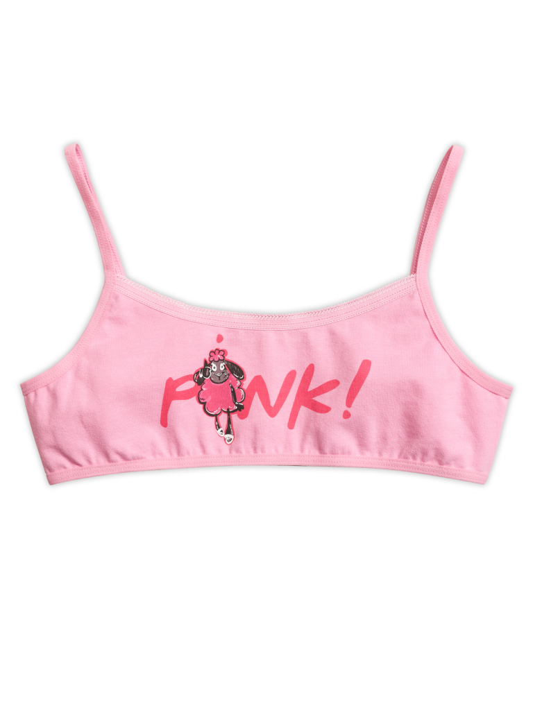 Топ для девочек на тонких бретелях из эластика. Горловина декорирована эластиком с фестонным краем. По низу изделия и проймам эластик.