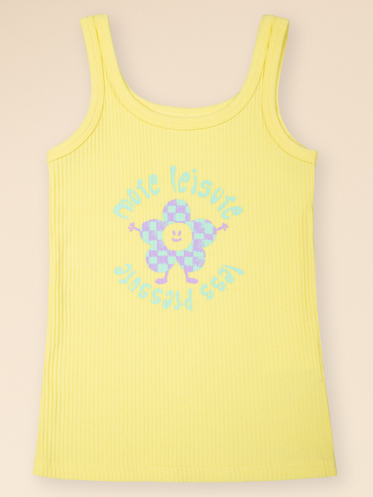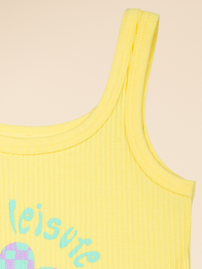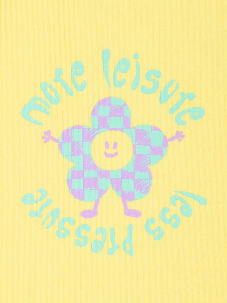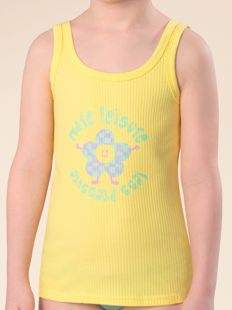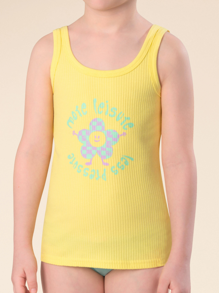 Если вы находитесь в поисках красивого и комфортного белья для своей дочки, обратите внимание на нашу изящную майку из модной ткани в рубчик для девочки. Модель выполнена из кашкорсе с высоким содержанием хлопка — изделие мягкое, воздухопроницаемое, кожа ребёнка дышит. Эластан в составе помогает майке сохранять великолепную форму, даже при частых стирках. Горловина и проймы обработаны эластичным пайпингом в тон — они не растягиваются, остаются в первозданном виде долго. Модель комфортно сидит по фигуре, подходит для носки под блузкой, джемпером, платьем. Изделие представлено в двух цветах. Классический белый вариант универсален, его можно надеть под белую блузку. Интересный бледно-желтый смотрится очень нежно и понравится любой девочке. Майку украшает забавный принт с позитивной надписью. Перевод принта: "Больше досуга, меньше давления". Принт мягкий и стойкий, замечательно переносит стирки. Отличный выбор для повседневной носки, сна, отдыха. Станет замечательным подарком, который способен вызвать искреннюю
