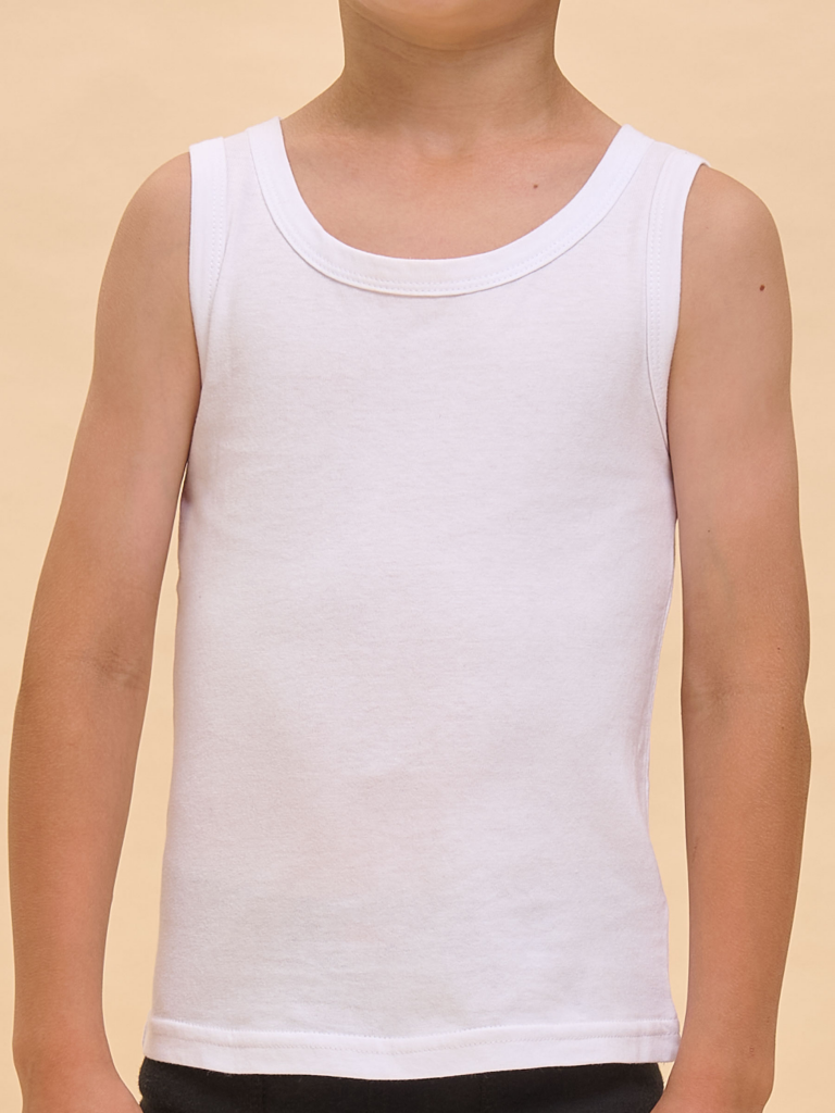 Бельевая майка для мальчика из 100% натурального хлопка. Пошив высокого качества, аккуратные швы, которые не доставят дискомфорт ребенку. Майка на широких бретельках идеально впишется в гардероб мальчиков как детское нижнее белье. Удобная и практичная модель майки для детей подходит для повседневной носки дома как одежда для сна, в детский сад, для занятия спортом.