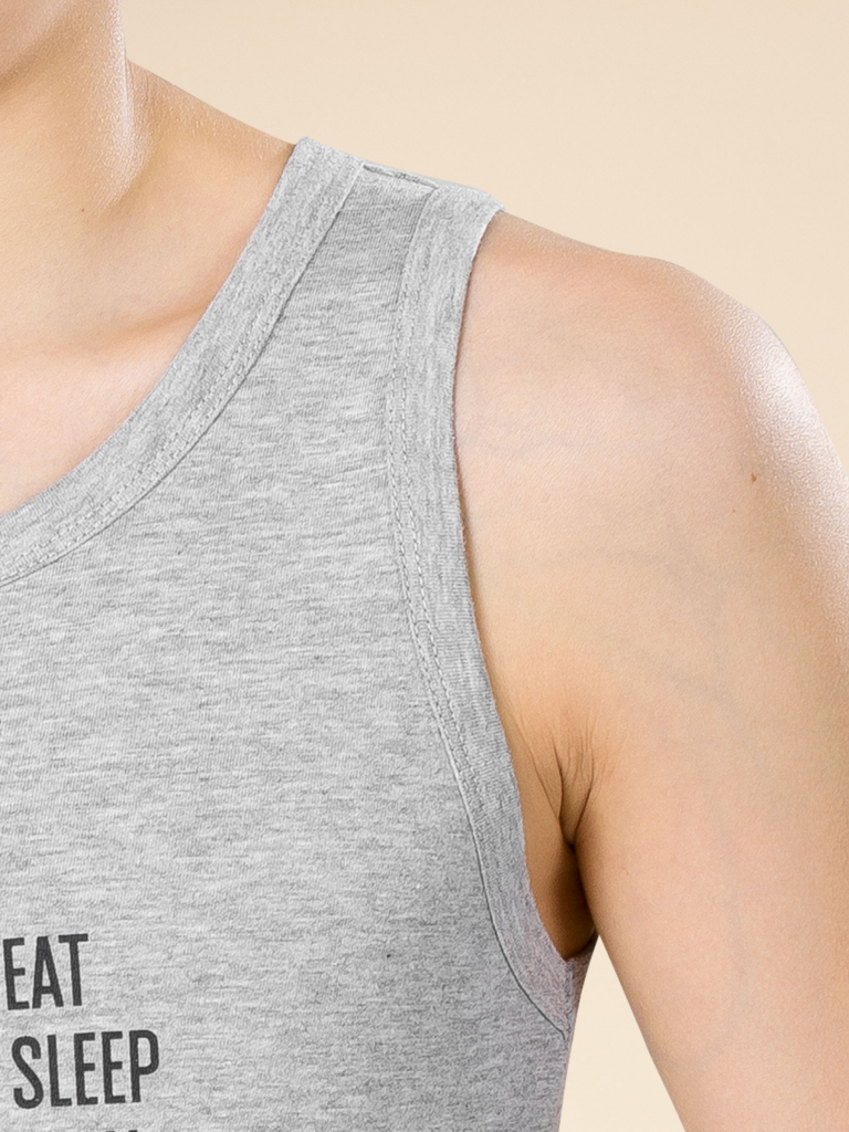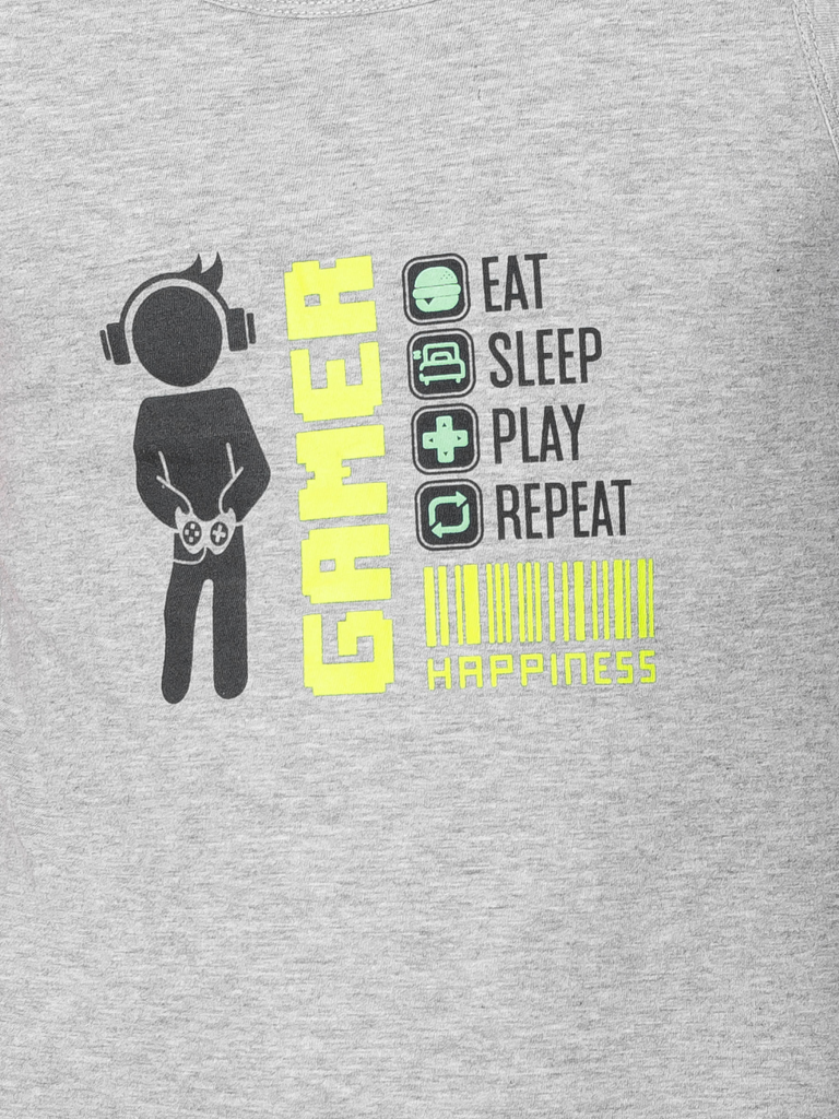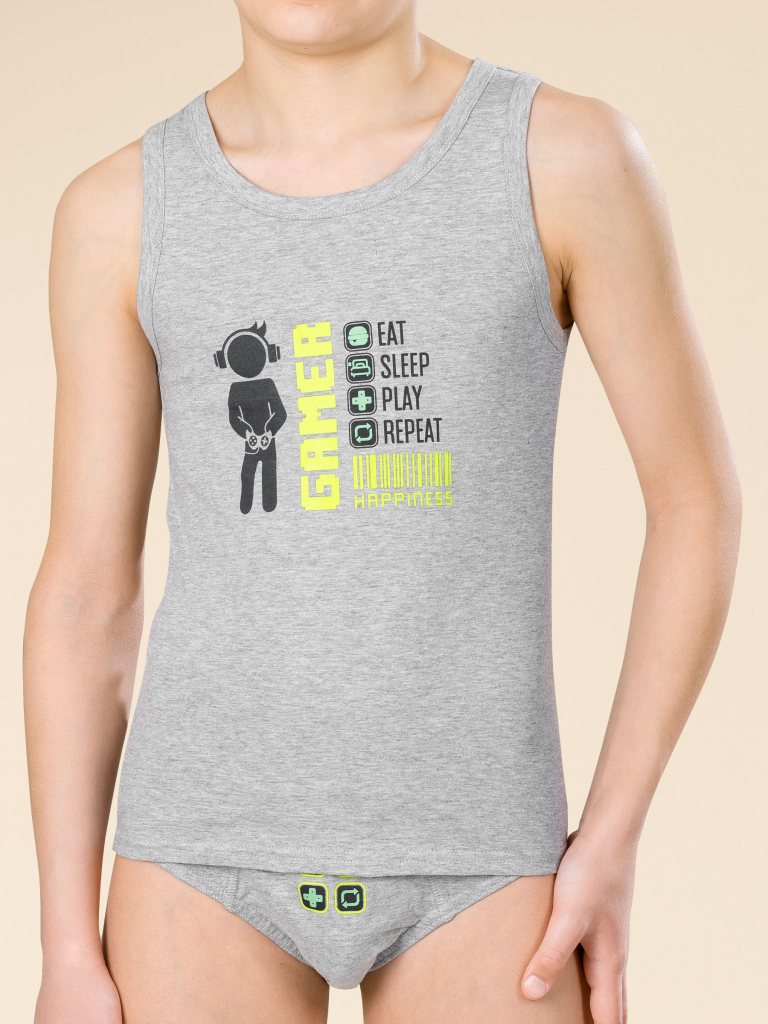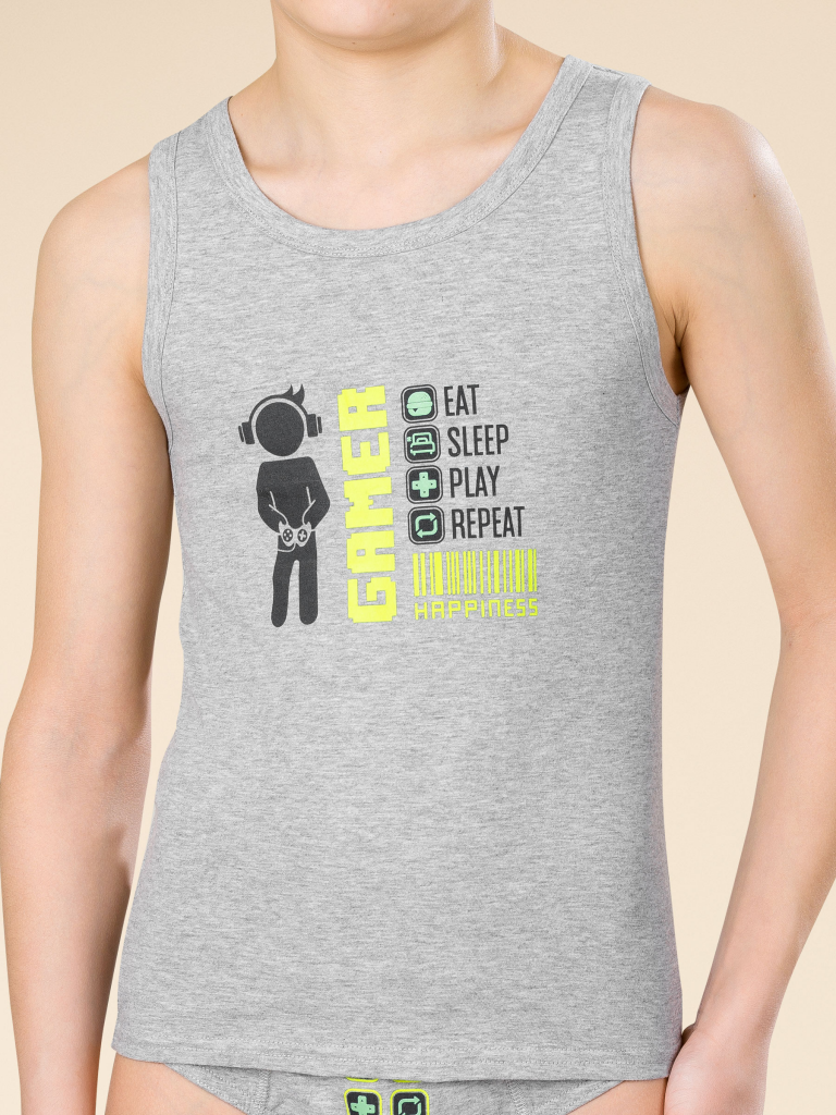 Если вы в поисках качественного, комфортного и стильного белья для своего ребёнка, обратите внимание на нашу майку из 100% хлопка для мальчика. Натуральный состав ткани обеспечивает изделию мягкость и воздухопроницаемость — кожа ребёнка дышит. Модель комфортно сидит по фигуре, её можно надевать под рубашку, джемпер, свитер. Горловина и проймы изделия обработаны в тон изделия — они хорошо держат форму, мягкие, надолго сохраняют аккуратный внешний вид. Майка представлена в актуальном оттенке "серый меланж". Практичный и универсальный, он великолепно сочетается с любой одеждой. Модель украшает забавный принт геймерской тематики — понравится любому мальчишке! Перевод: "есть, спать, играть, повторять. Счастье". Принт эластичный и прочный — отлично переносит частые стирки. Такая майка идеальна для повседневной носки, а также для отдыха. Станет замечательным подарком, который способен вызвать искреннюю радость у каждого ребёнка, оставив незабываемые воспоминания о любом празднике и принося массу удовольствия каждый