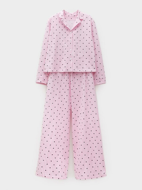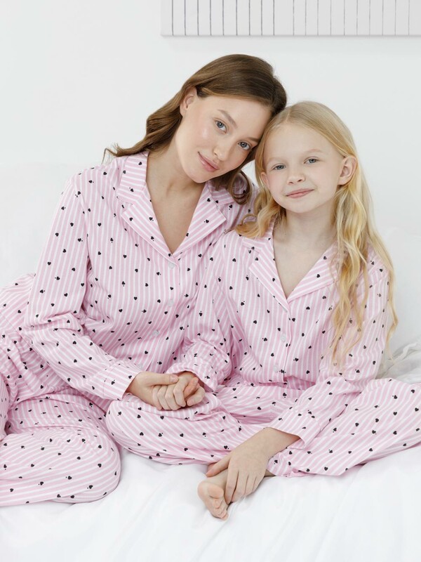 Трикотажная пижама из натурального хлопка для комфортного сна и отдыха. Рубашка на пуговицах с длинными рукавами и широкие брюки с мягкой эластичной резинкой в поясе. Гладкий материал приятен к телу, не теряет форму и позволяет коже дышать. Набивной рисунок выполнен из стойких текстильных гипоаллергенных красителей. Все трикотажные полотна производятся в соответствии с нормами швейцарского сертификата ЭкоТекс.