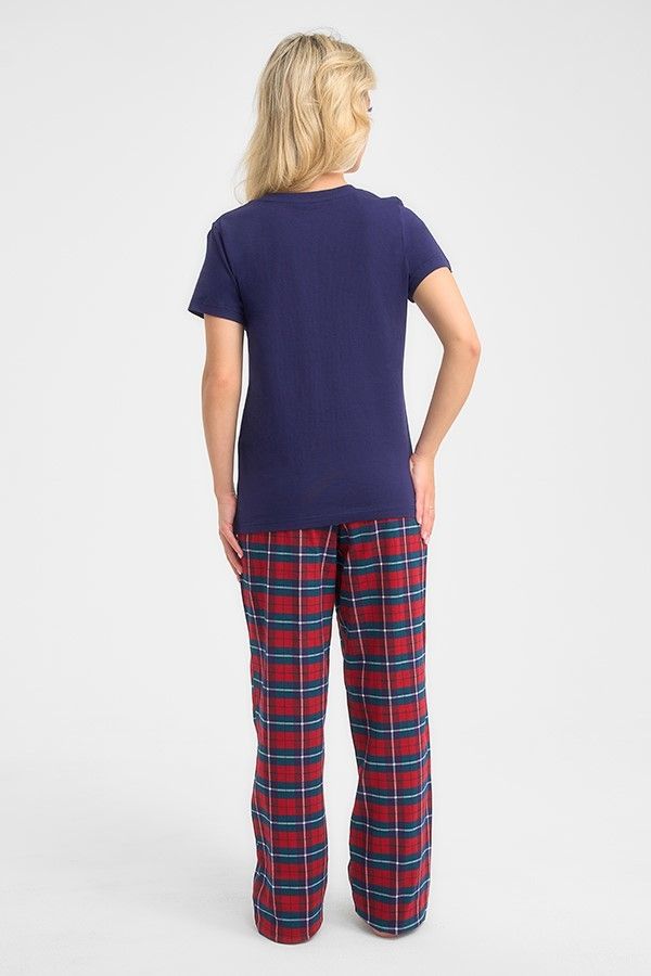 Трикотажная пижама с Новогодней тематикой. Синяя футболка свободного кроя длиной до бердра украшена принтом "сердечко из снежинок" с написью "Let it snow" Принтованные брюки свободного кроя на резинке.