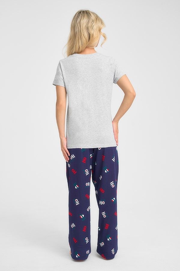 Трикотажная пижама с Новогодней тематикой. Серая футболка свободного кроя длиной до бердра украшена принтом рожки, глазки и носик оленя и надписью "Ho Ho Ho" . Брюки на резинке, свободного кроя, темно-синего цвета в белые и красные принтованые слоги "HO" .
