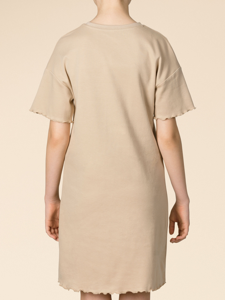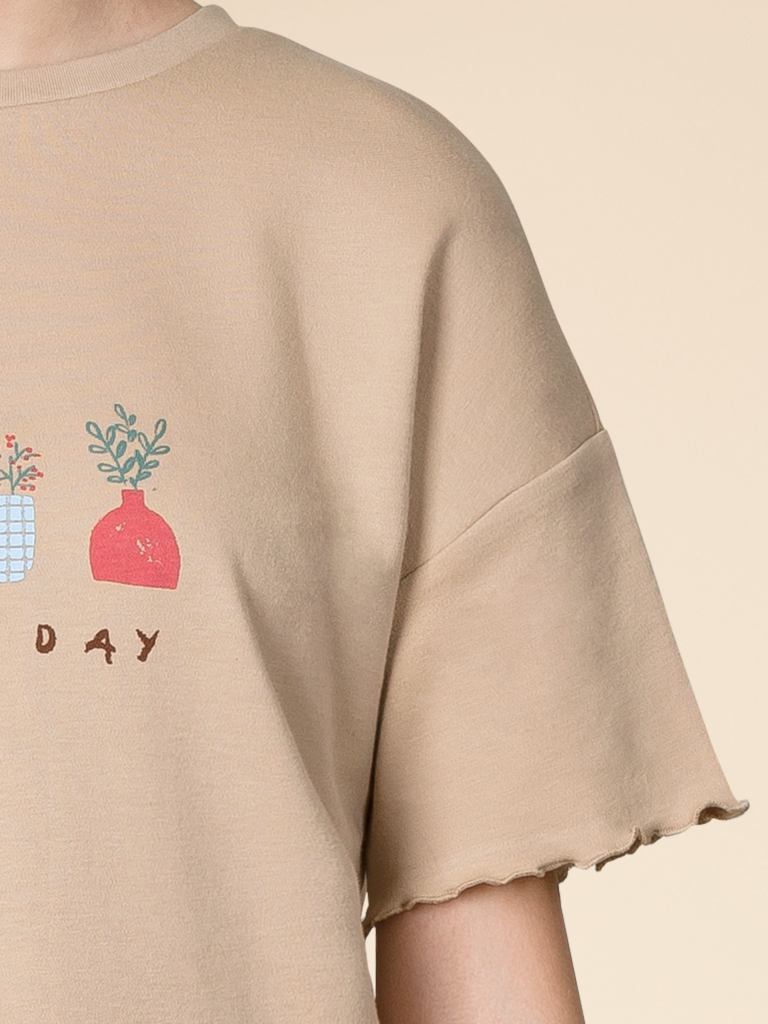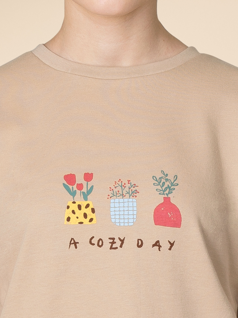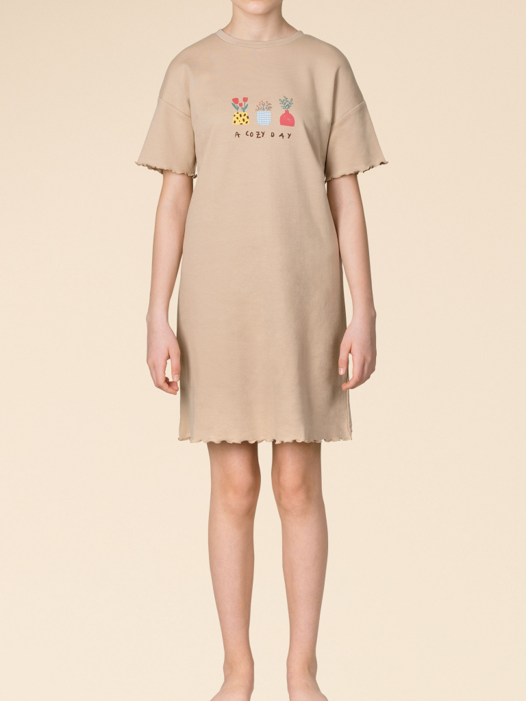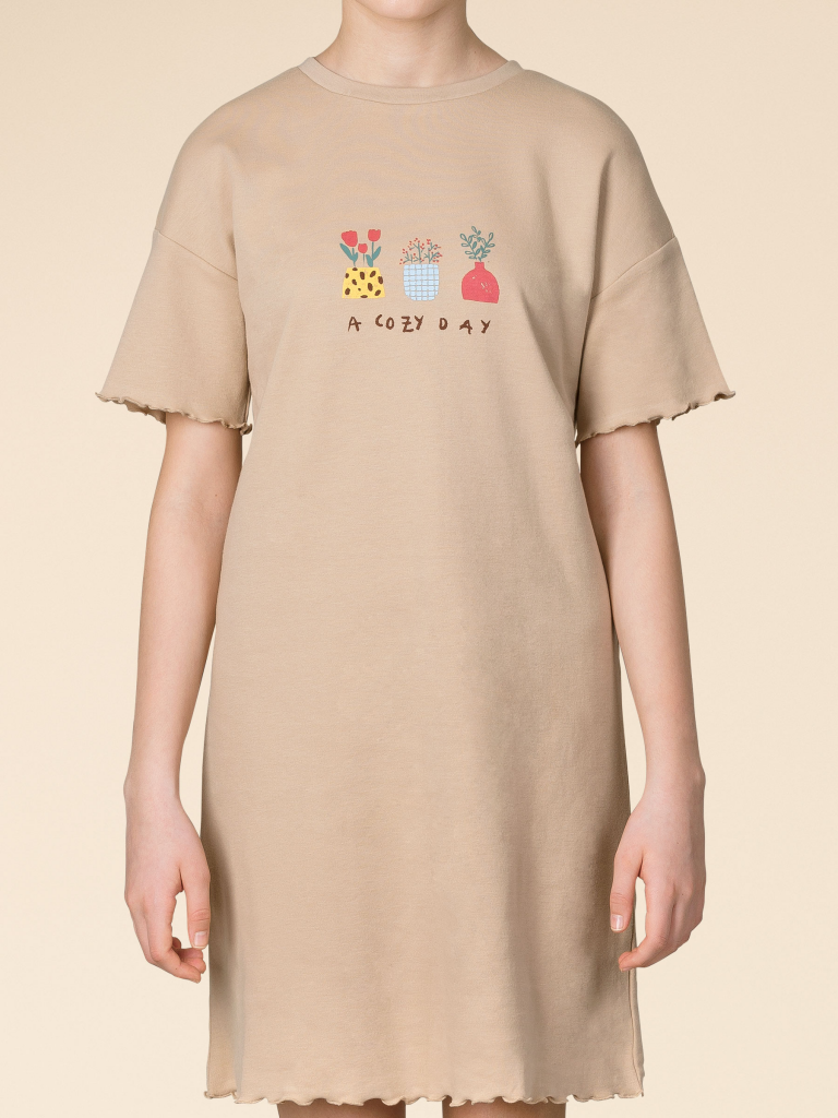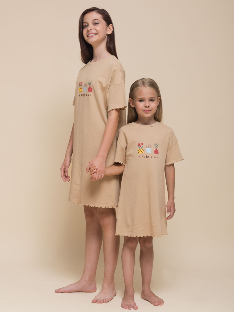 Красивая и очень уютная ночная сорочка в стиле "хюгге" для девочки. В составе ткани 100% хлопка — изделие мягкое, великолепно пропускает воздух, давая коже ребёнка дышать. Идеальный вариант для детской одежды! Сорочка комфортного прямого кроя — в ней уютно и удобно спать. Домашнее платье нежного бежевого цвета "овсяное молоко" украшено милым цветочным принтом с текстом "уютный дом" на груди. Принт мягкий и эластичный, отлично переносит многочисленные стирки. Сорочка украшена декоративной обработкой "салатный край" по низу и краям рукавов — стильно и по-девичьи. Такая сорочка идеальна для сна как дома, так и в детском саду, а также как домашняя одежда — прекрасный подарок любой девочке, дочке, внучке, племяннице.