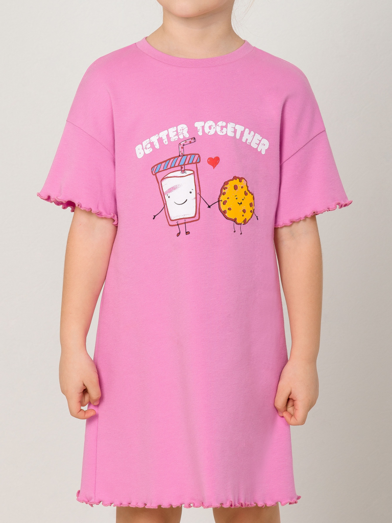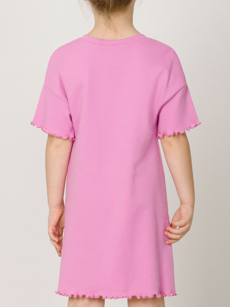Ночная сорочка для девочки из 100% хлопка. Можно носить как домашнее платье. Модель свободного кроя, увеличенной длины до колена. Спущенное плечо, удлиненный, чуть расклешенный рукав. Обработка низа рукава и изделия "в закрутку" образует волнистый край. Мягкий принт устойчив к частым стиркам. Подходит для ежедневной носки и для сна. Идеальный подарок.