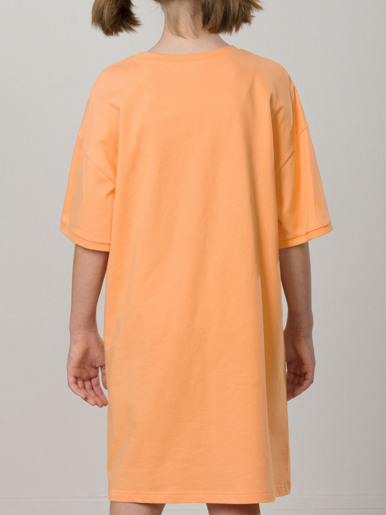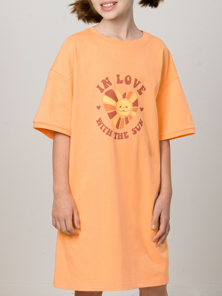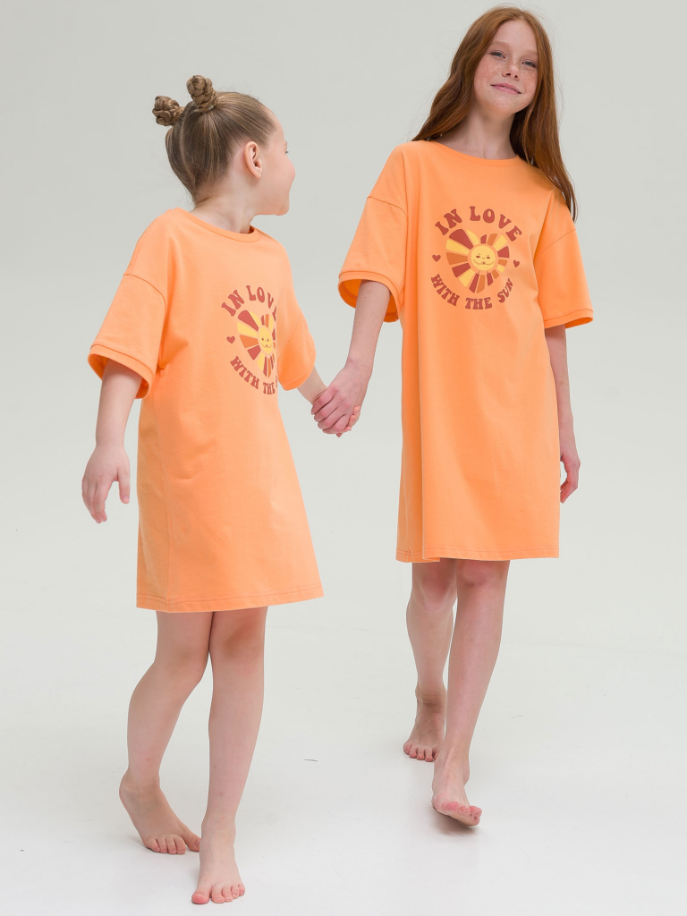 Детская ночная сорочка для девочек из 100% хлопка. Можно носить как домашнее платье. Платье силуэта оверсайз, объемное, со спущенным широким рукавом. Свободный крой, удлиненные рукава – комфорт и легкость движений. Принт спереди настраивает на позитив и лето.