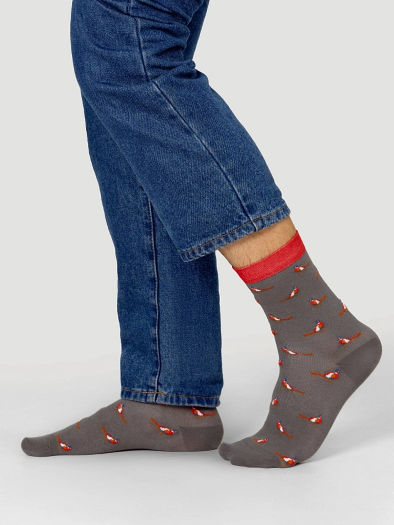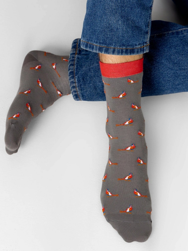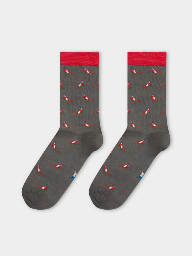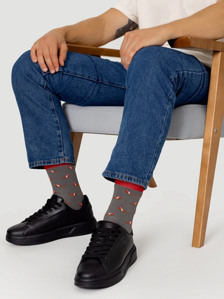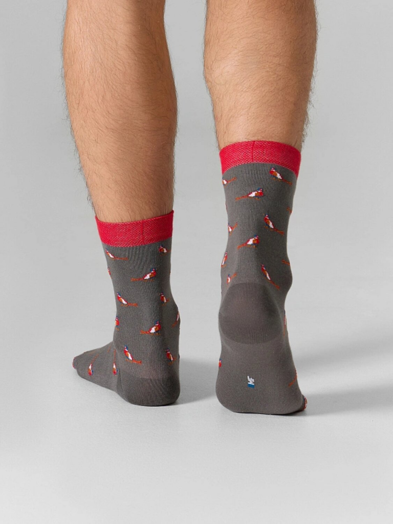 рис.2939 Мужской носок классический, высокий с рисунком в виде мелких попугаев и цветным бортиком.